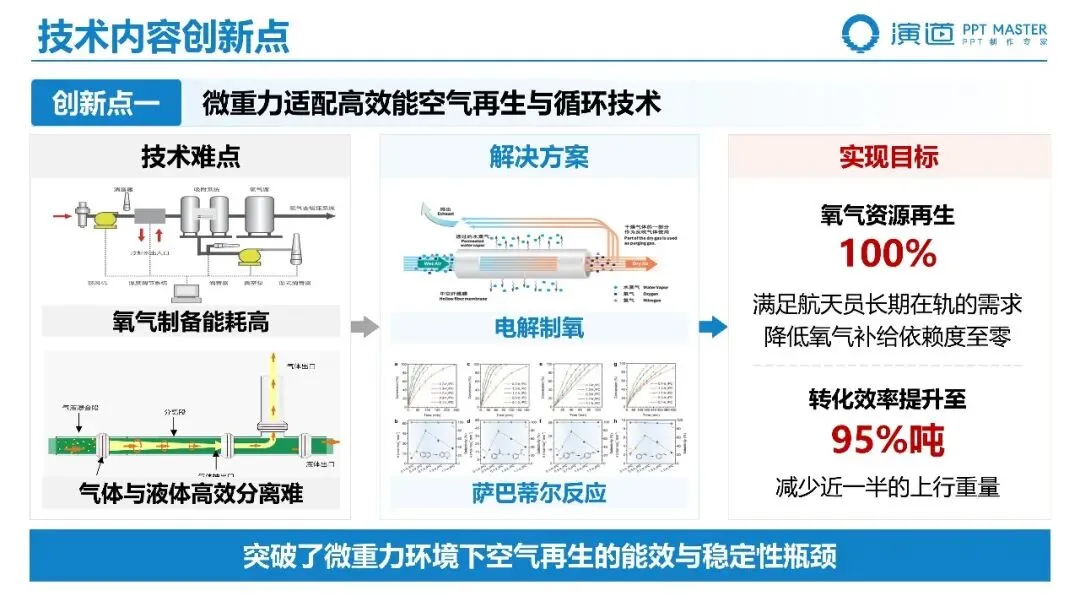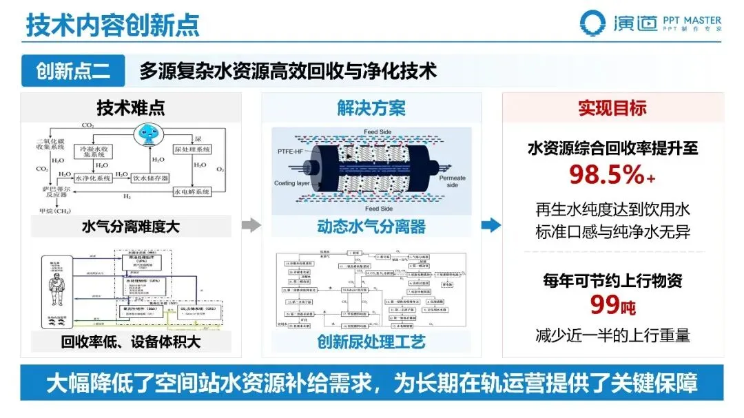 空气再生技术:突破微重力适配高效能空气再生与循环技术,通过电解制氧与萨巴蒂尔反应,实现氧气资源再生 100%、转化效率提升至 95% 吨,降低氧气补给依赖度至零,减少近一半上行重量。水资源回收技术:研发多源复杂水资源高效回收与净化技术,通过动态水气分离器与创新尿处理工艺,使水资源综合回收率提升至 98.5% 以上,再生水达到饮用水标准,每年可节约上行物资 99 吨,大幅降低补给需求。四、评价