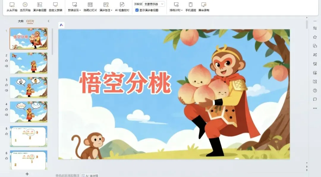 幼儿园大班数学《悟空分桃》PPT+教案完整版:当孩子为“公平分享”摆出2+2=4时,数学的种子发芽了.