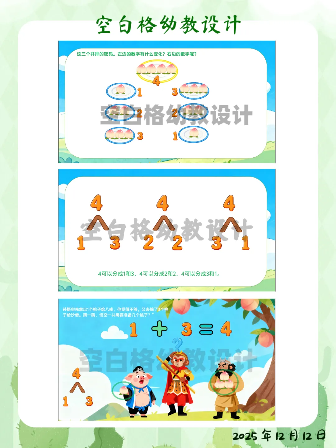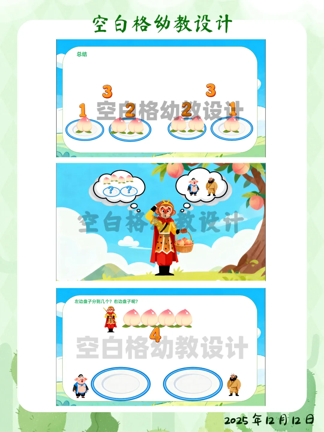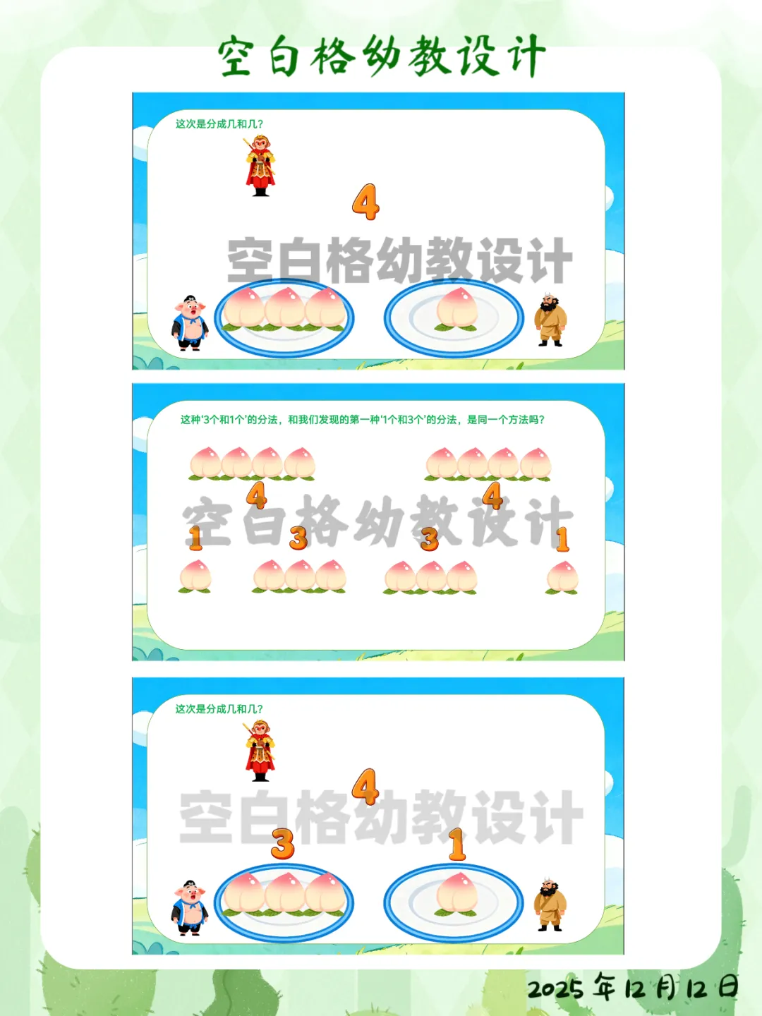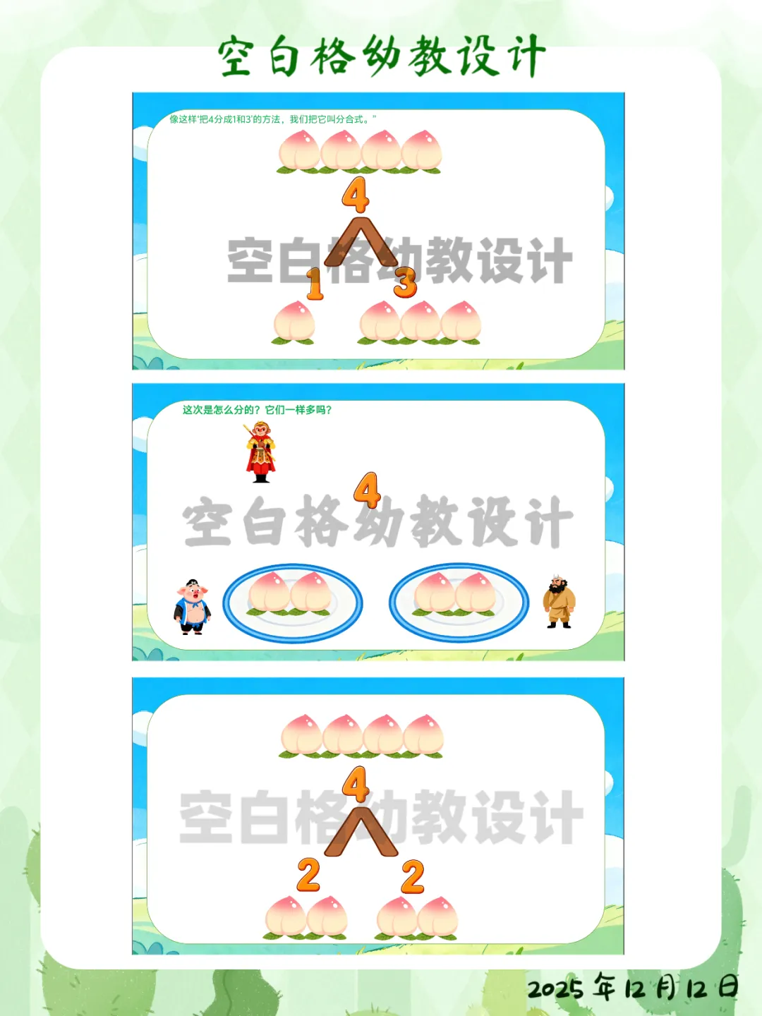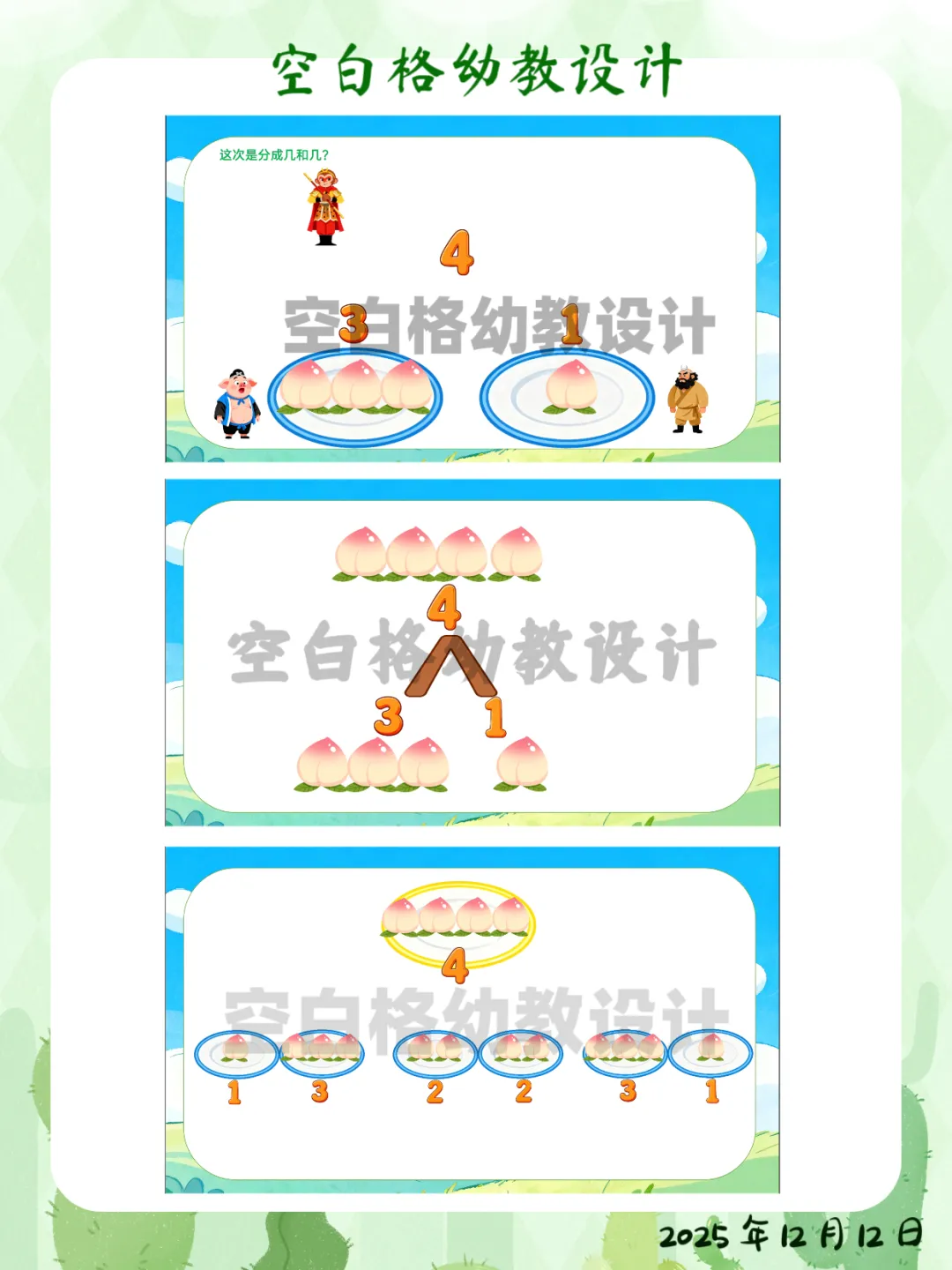 ✅ 区域活动:在数学区创设“智慧果乐园”,投放5个、6个水果操作材料,鼓励幼儿探索更多数量的分合方法。✅ 家园共育:鼓励幼儿回家后当“家庭数学小老师”,用4块饼干、4个水果给家人演示不同的分法,并讲加减法故事。这堂让孩子化身“数学小侦探”的《悟空分桃》,完整教案+精美PPT已整理好。关注我,让我们一起,做那个在孩子心中种下数学兴趣种子的播种人吧!