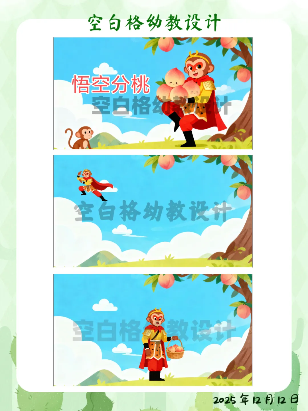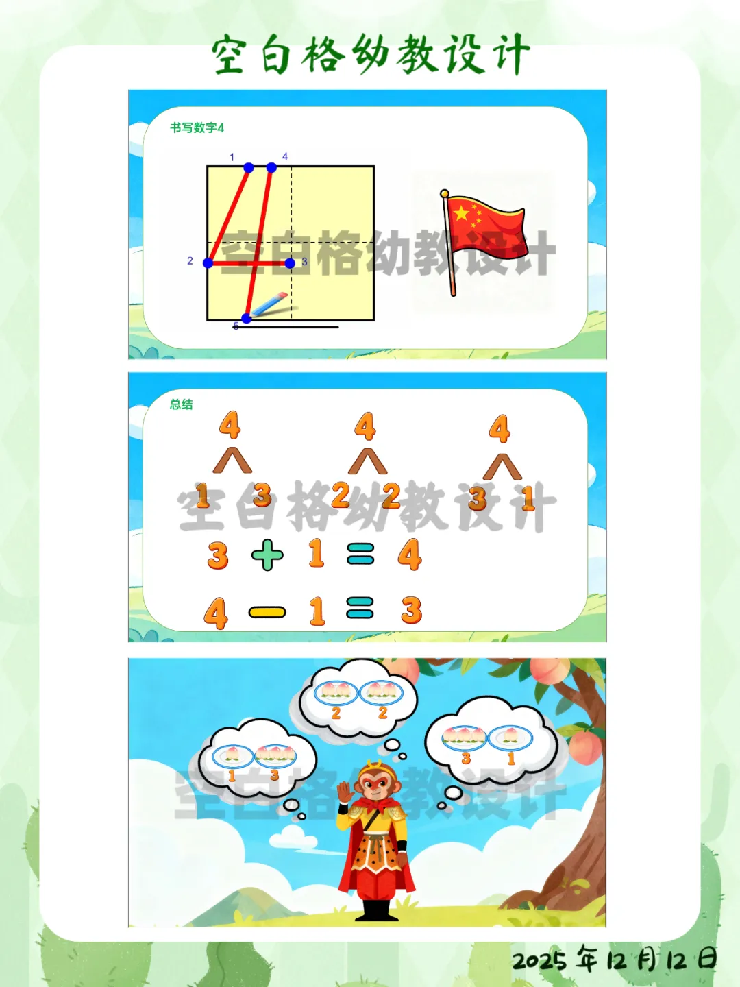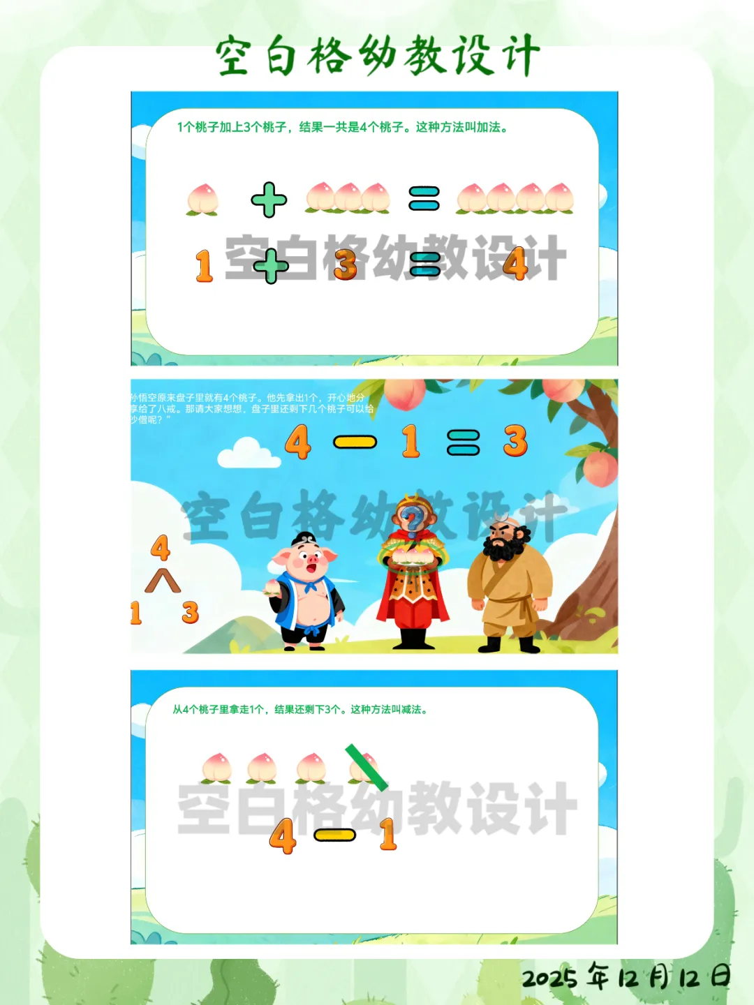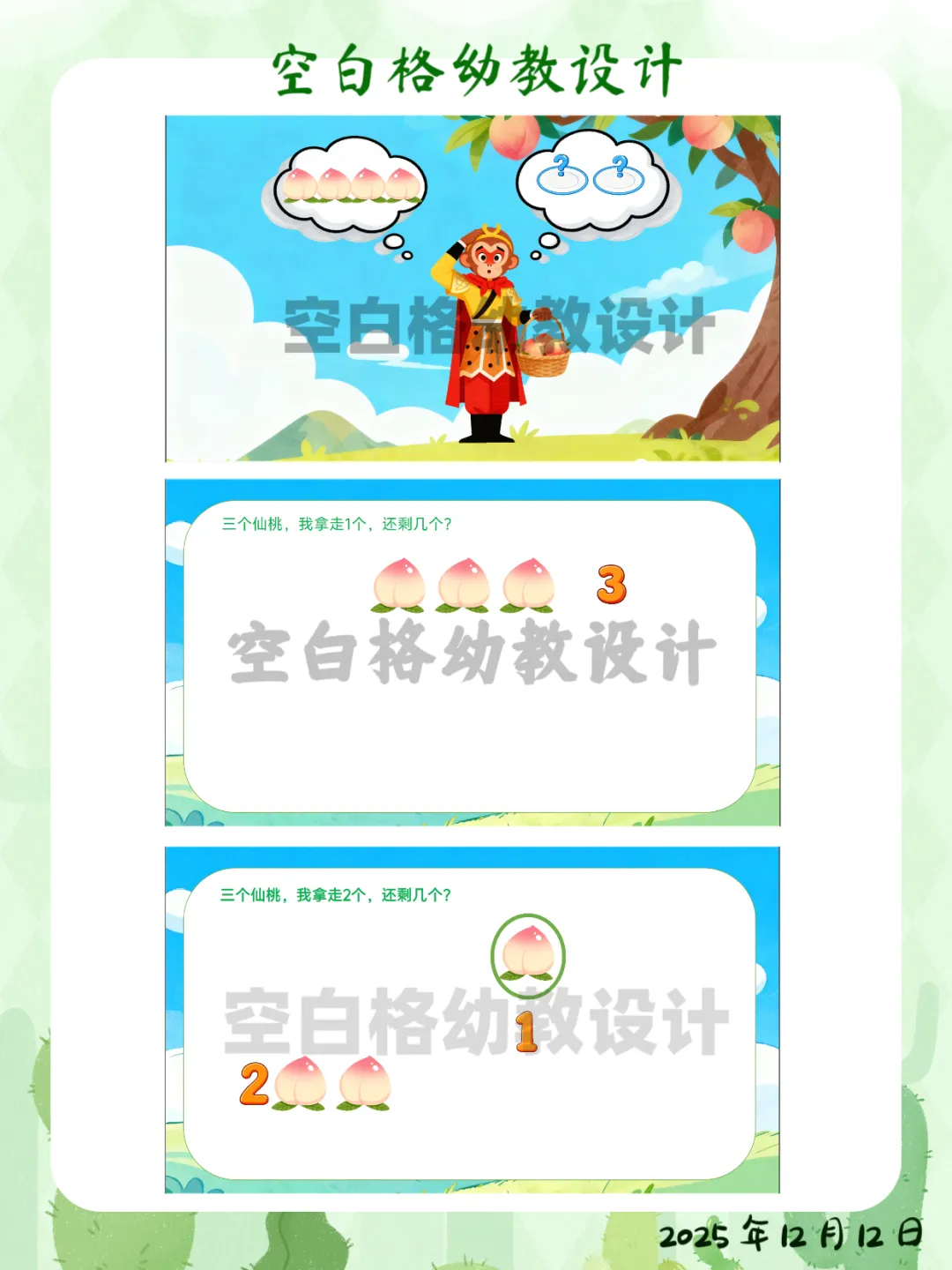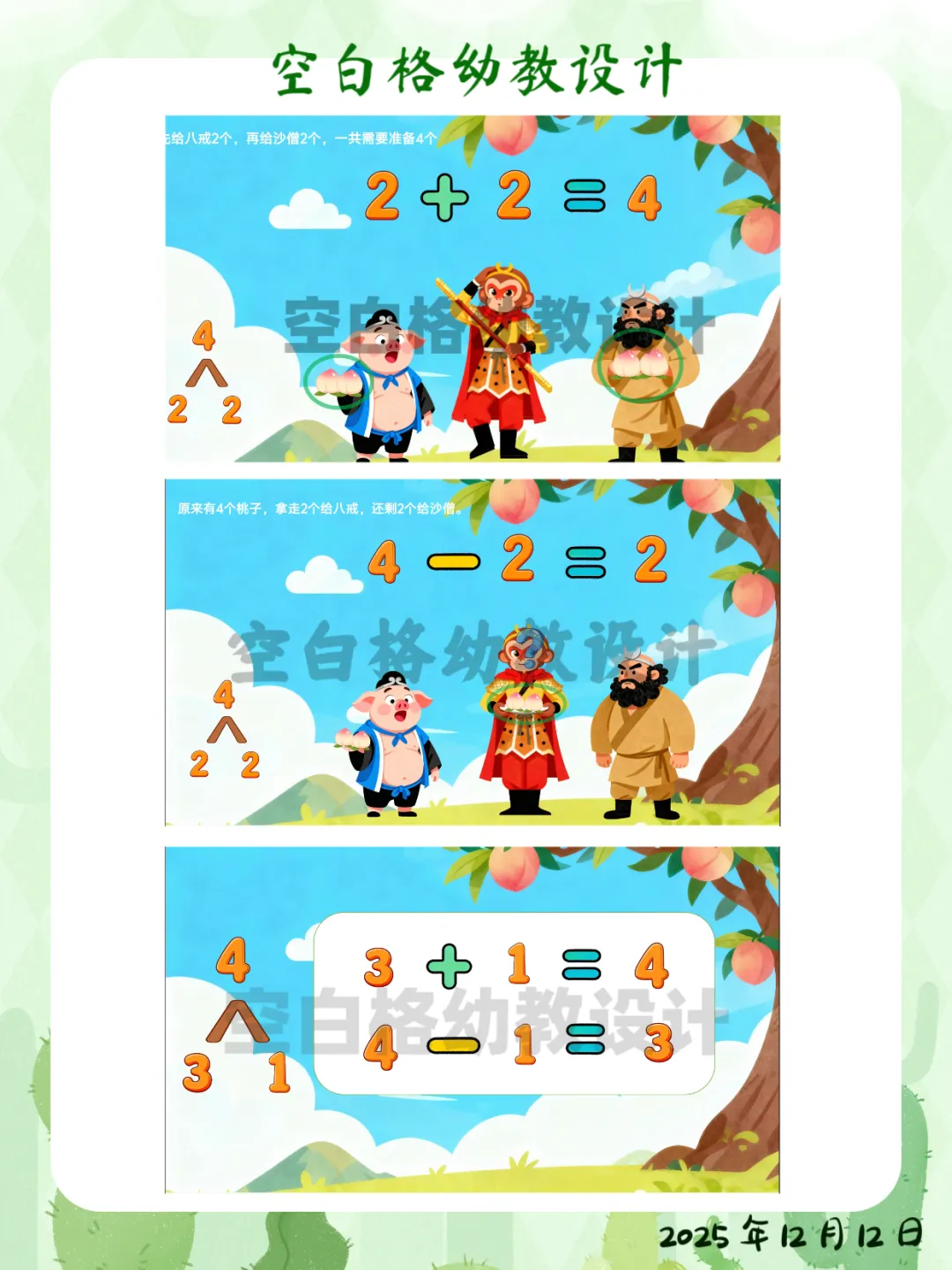 ✅ 区域活动:在数学区创设“智慧果乐园”,投放5个、6个水果操作材料,鼓励幼儿探索更多数量的分合方法。✅ 家园共育:鼓励幼儿回家后当“家庭数学小老师”,用4块饼干、4个水果给家人演示不同的分法,并讲加减法故事。这堂让孩子化身“数学小侦探”的《悟空分桃》,完整教案+精美PPT已整理好。关注我,让我们一起,做那个在孩子心中种下数学兴趣种子的播种人吧!