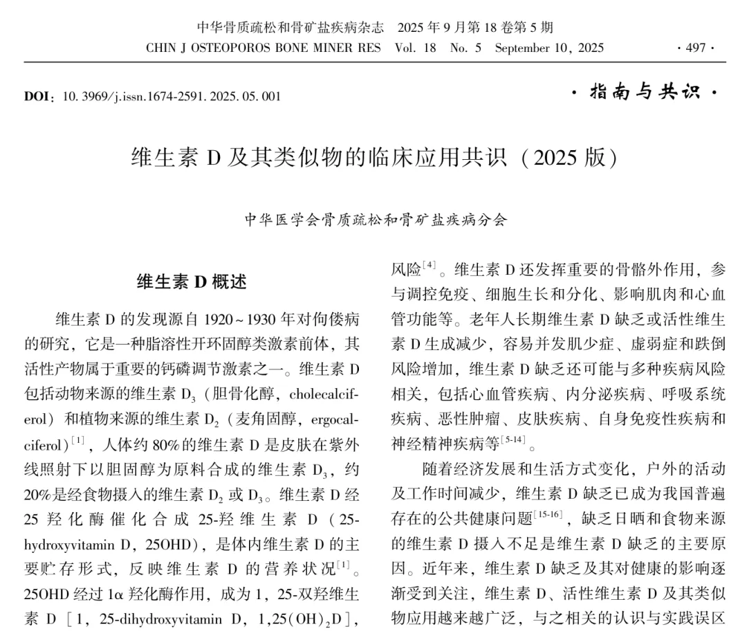 《维生素 D 及其类似物的临床应用共识 (2025 版)》由中华医学会骨质疏松和骨矿盐疾病分会制定,系统梳理了维生素 D 的代谢、检测、临床应用及安全规范,为临床实践提供循证指导。维生素 D 是脂溶性激素前体,80% 由皮肤经紫外线合成,20% 从食物摄入,经肝肾两次羟化生成活性产物 1,25 (OH)₂D,调控钙磷稳态、骨代谢及免疫、心血管等骨骼外功能,我国人群维生素 D 缺乏患病率达 61.3%,已成公共健康问题。