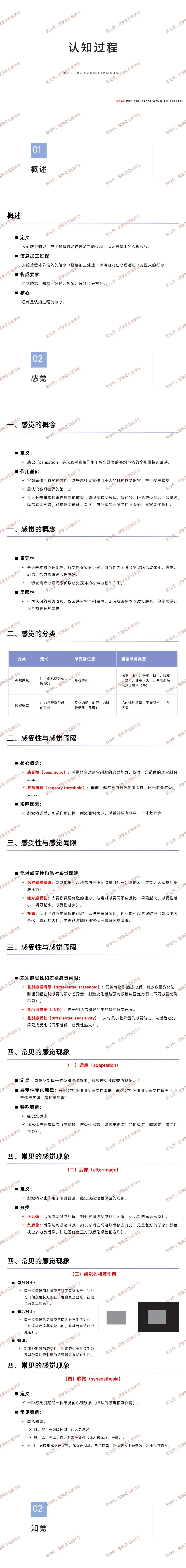 - 后像:刺激停止后感觉短暂保留(正后像与原刺激一致,如闭眼后仍见灯光;负后像与原刺激相反,如注视红色后见绿色)。