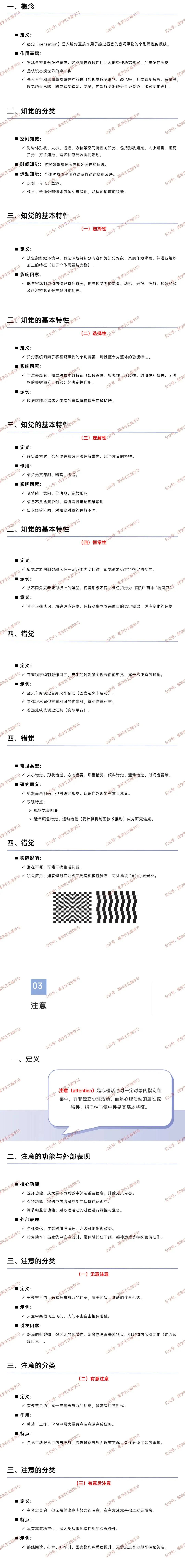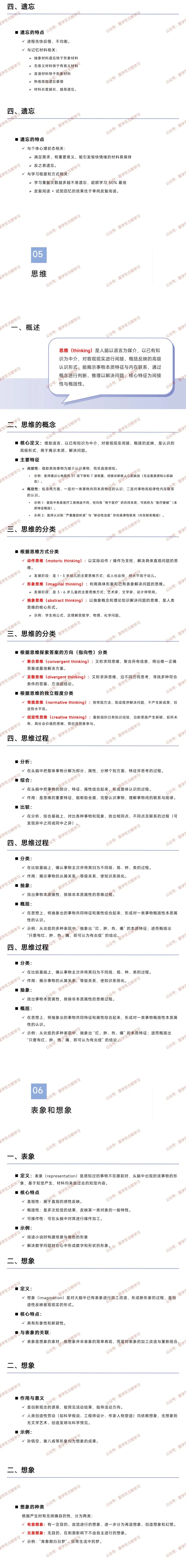 - 信息加工逻辑:外界刺激→感觉(个别属性)→知觉(整体认识)→注意(筛选聚焦)→记忆(储存提取)→思维(本质概括)→想象(创新构建),形成完整认知链。