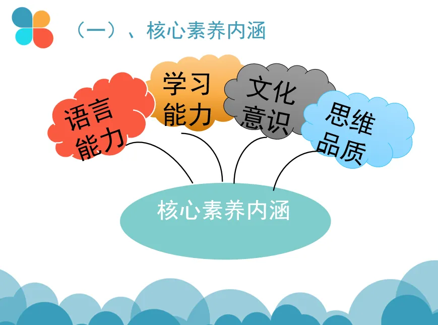 语言能力是核心素养的基础要素,文化意识体现核心素养的价值取向,思维品质反映核心素养的心智特征,学习能力是核心素养发展的关键要素。核心素养的四个方面相互渗透,融合互动,协同发展。