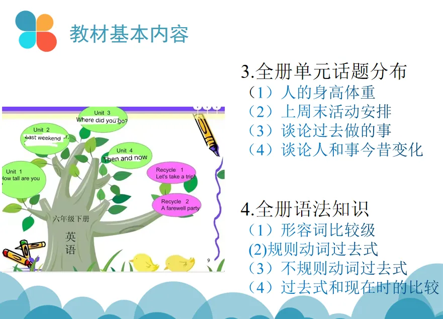 本册教材的新单元由原来的六个缩减为四个,我们可以用半个学期的时间完成新单元的教学,然后用4~6节课对这四个单元进行复习巩固。