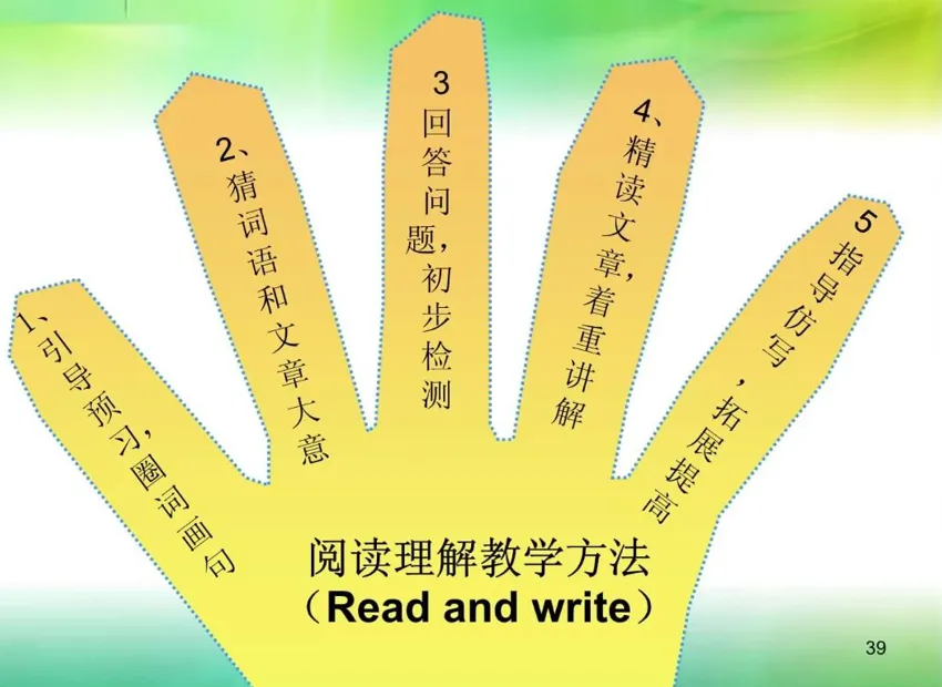接下来,便可以进行同伴或小组活动了。因为学生已经对句型完全理解,并十分清楚它的模式。好的学生可以尽可能多的发挥,接受能力最慢的学生也能看看黑板上句型的模式,表达出与同学对比的结果了。我们通过启发式的教学方法突出重点。由易及难的句型训练方式能真正让每个同学掌握语言点。现在许多英语课上存在我们忽略学生认知规律的现象,要么一设置情景就展开小组活动,让大家说,结果总是练了几个好的同学,很多同学在一旁看,开不了口;要么反复读,进行枯燥的没有会话语境的结构式操练,直至脱口而出,结果是学生学到的不是有用的语言而是死的句型,碰到真实的情况当然就很难表达。