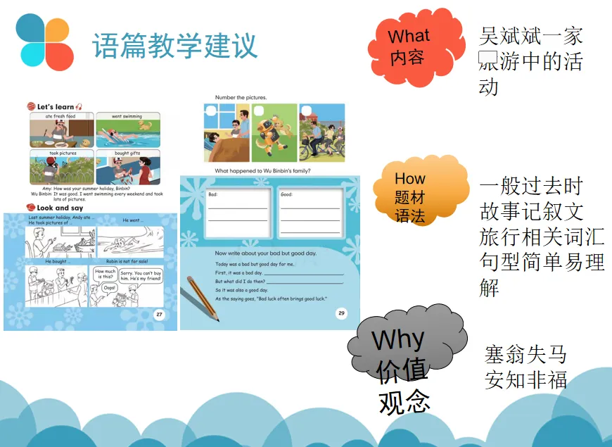 本册内容每个单元都包括以下语篇类型:主情景图;单词教学;对话教学;语篇教学;阶段复习教学;故事时间。