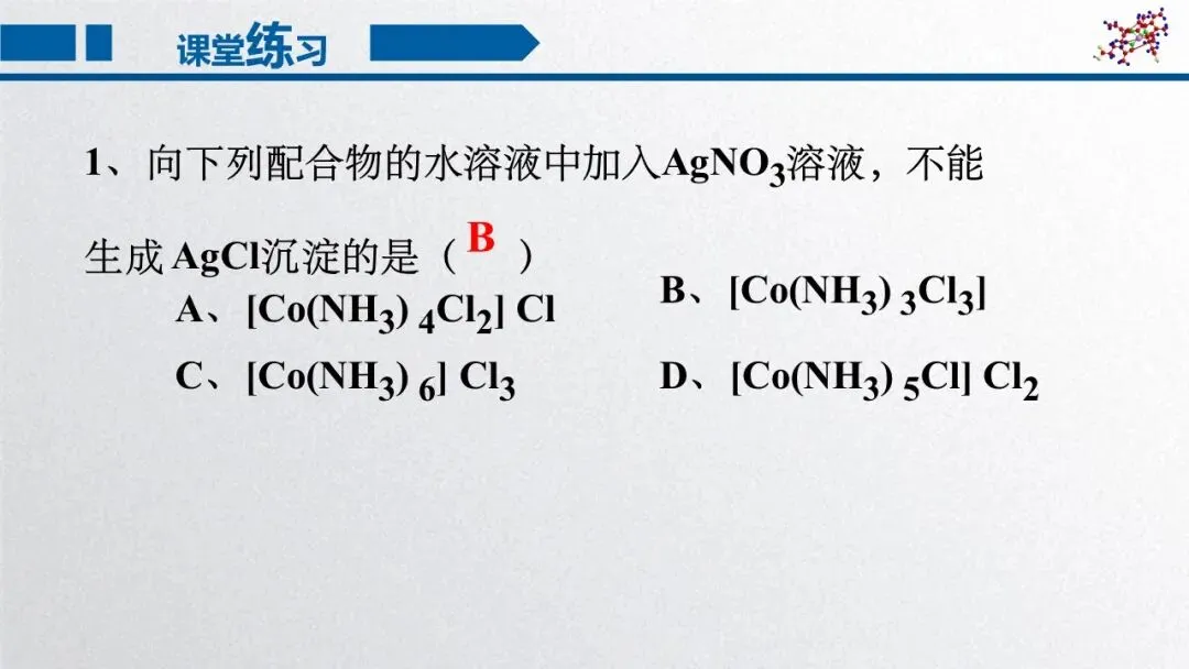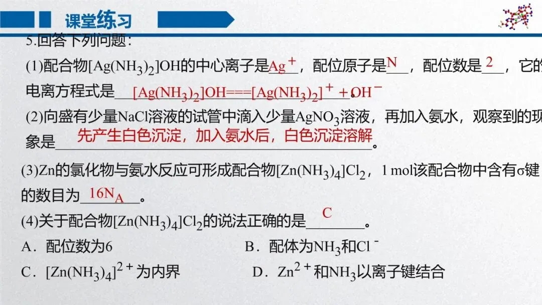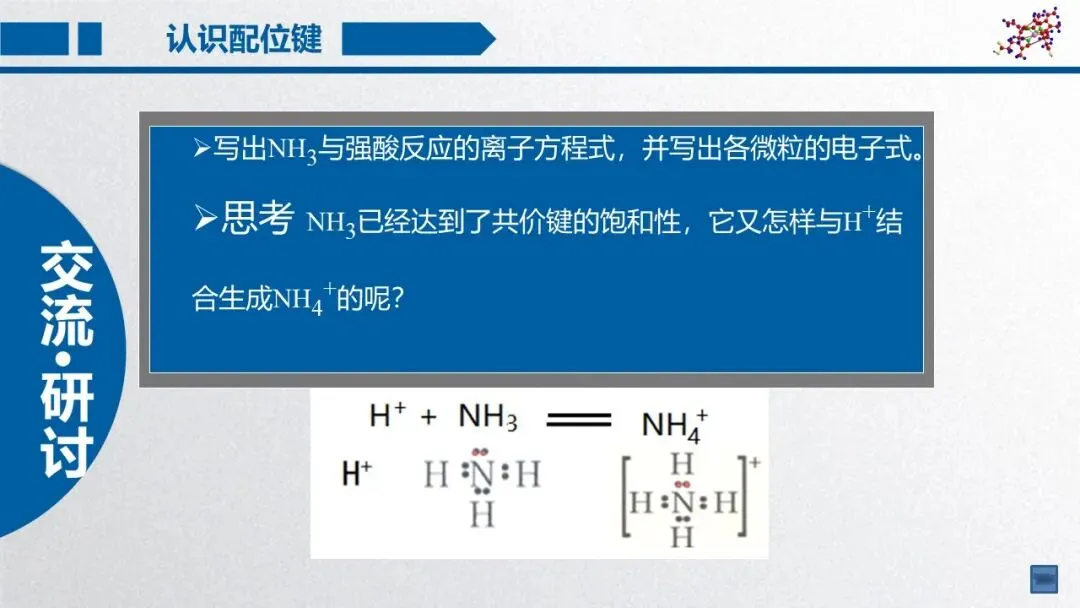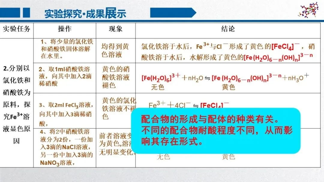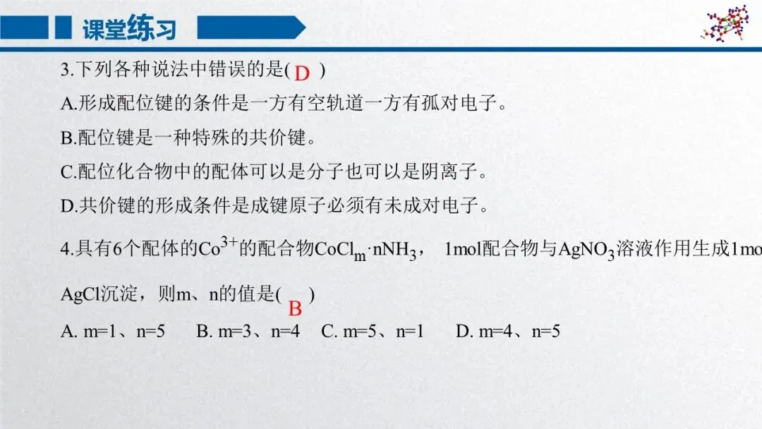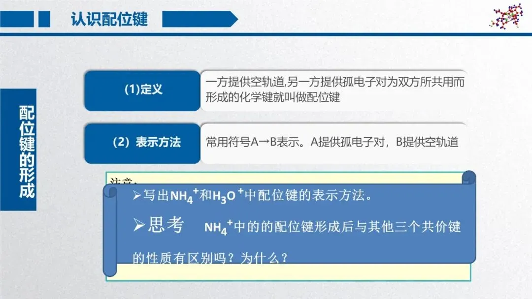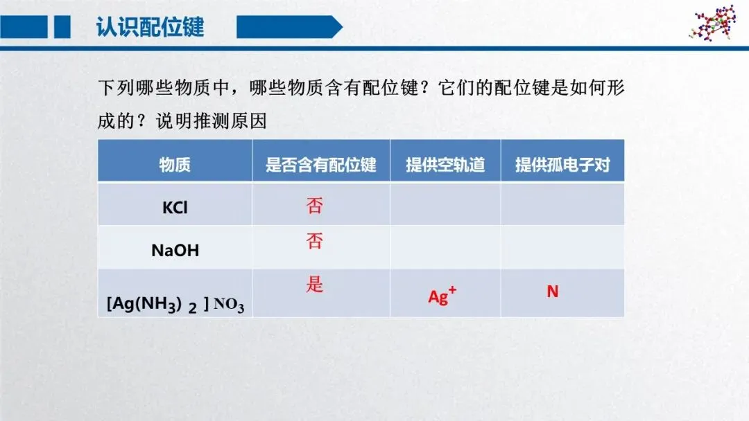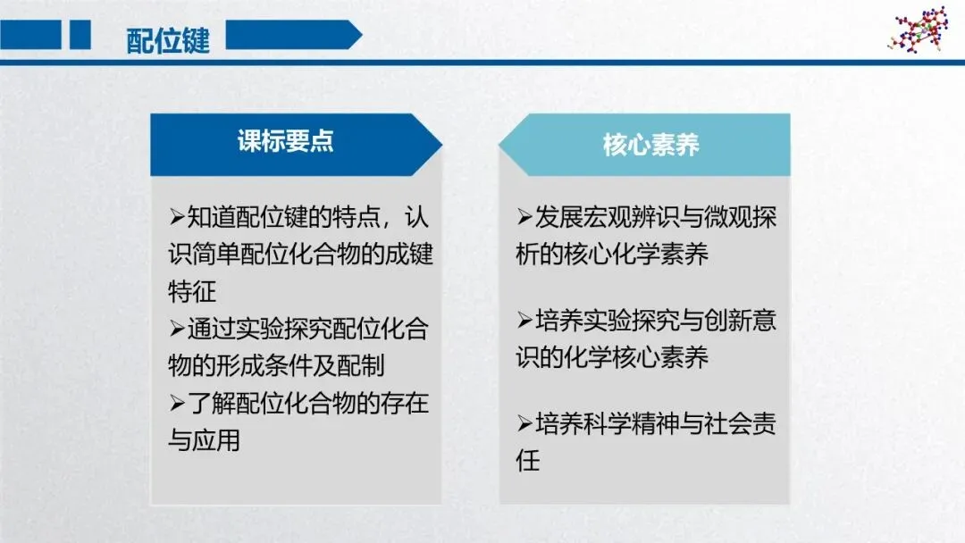 本节课围绕“配位键与配合物”这一核心概念展开,通过情境导入、实验探究、小组合作等多种教学方式,基本完成了预设的教学目标。学生能够理解配位键的形成机理,掌握配合物的基本组成,并能在实验中观察和分析配合物的形成过程。整体课堂氛围活跃,学生参与度较高,特别是在实验环节表现出较强的探究兴趣。