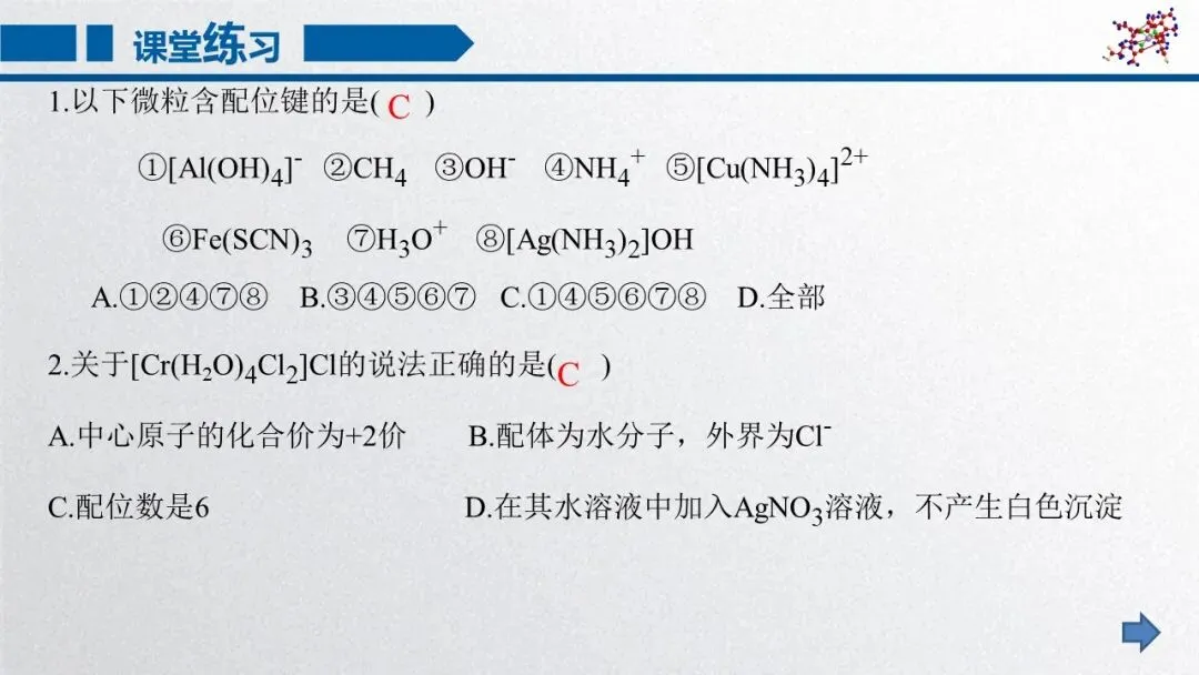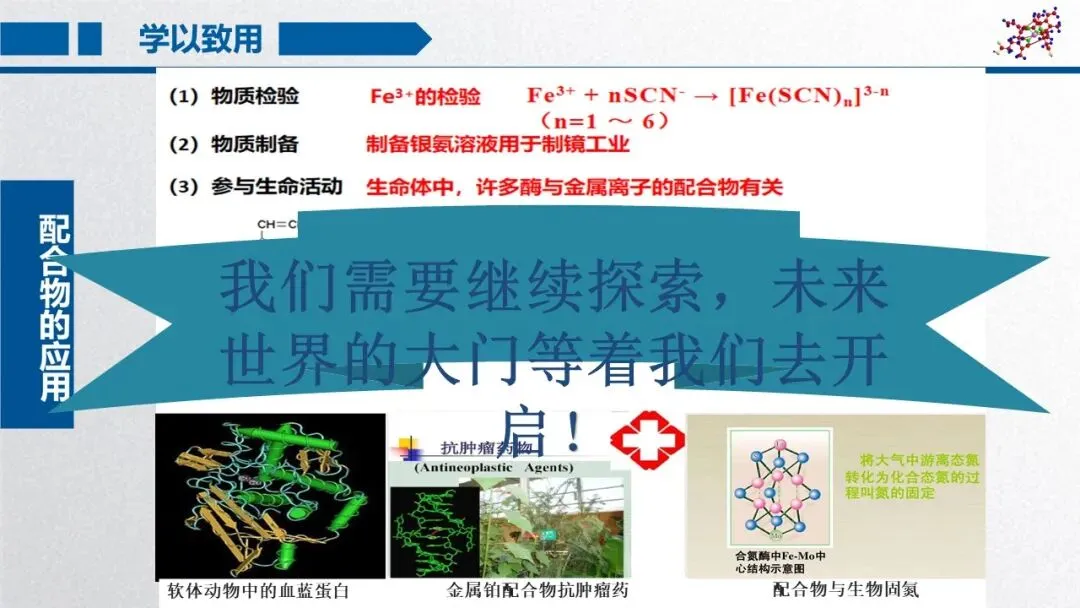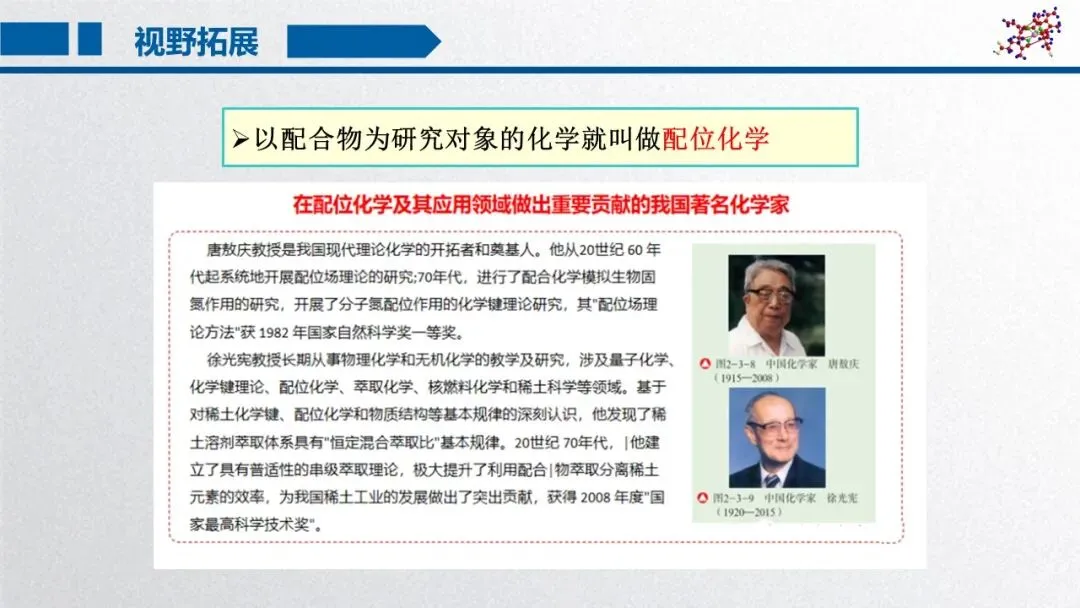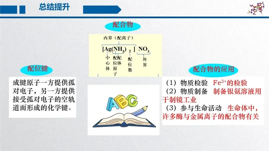 ·板书设计简洁明了,配合PPT图文并茂,帮助学生系统构建“配位键—配合物—应用”的知识框架。