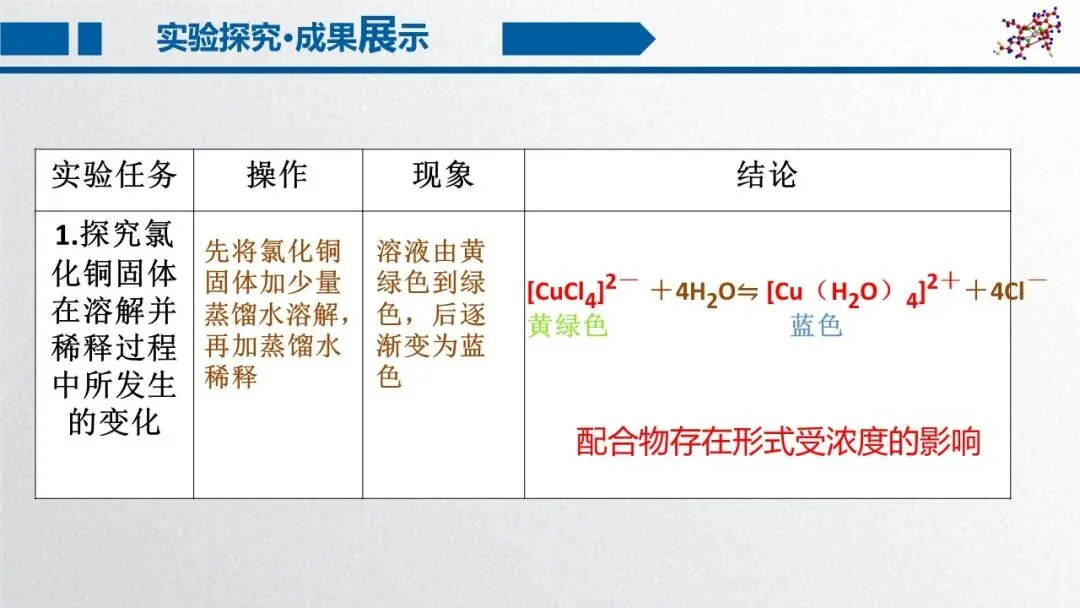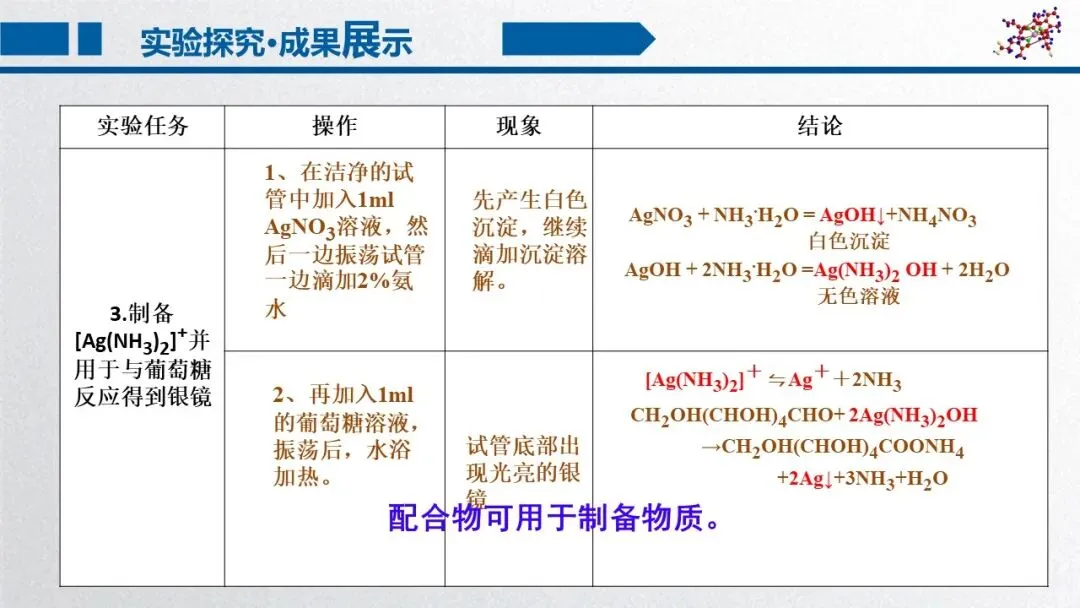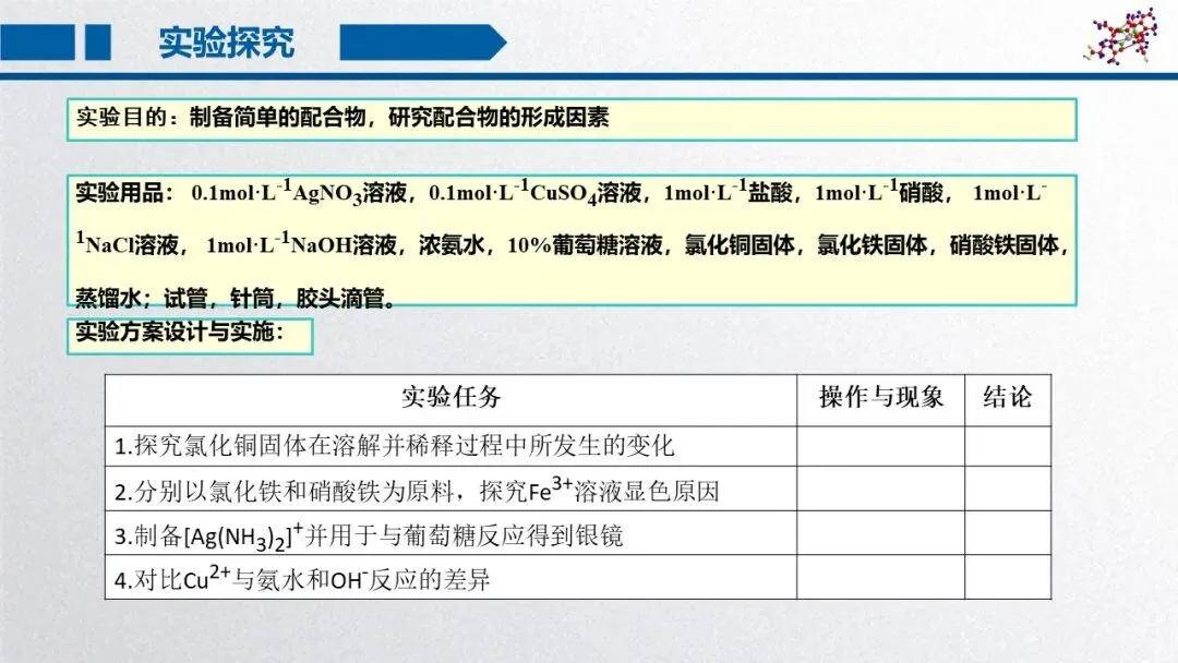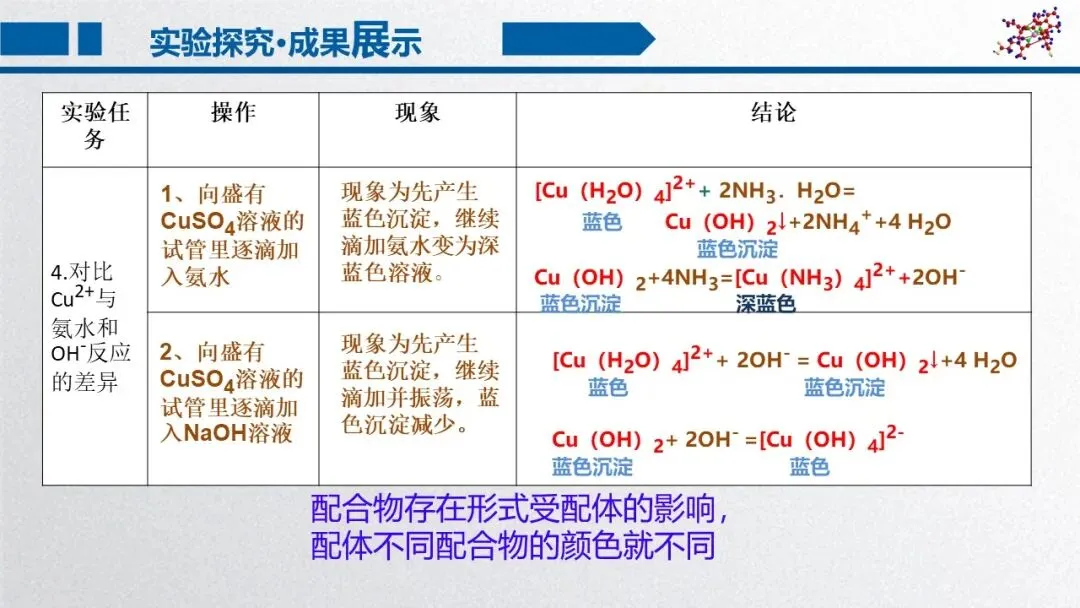 ·实验分小组进行,任务明确,操作性强。特别是“Cu²⁺与氨水反应”“Ag⁺与氨水反应”等实验现象明显,学生能直观感受配合物的形成与颜色变化,有效促进了“宏观—微观”联系的建立。