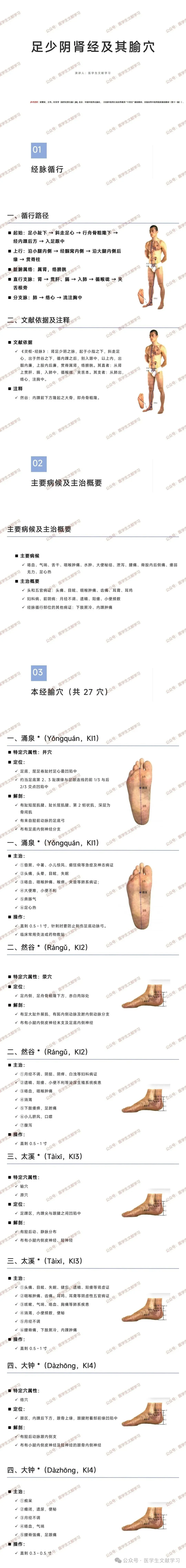 足少阴肾经以 “补肾益精、调理水液、通络止痛” 为核心功效,重点腧穴(涌泉、太溪、照海等)广泛应用于肾虚及相关脏腑病证。针刺时需注意穴位解剖位置,避免损伤血管、内脏,胸腹部位穴不可深刺,下肢部穴可适当深刺以增强疗效,临床常结合灸法或药物敷贴提升调理效果。