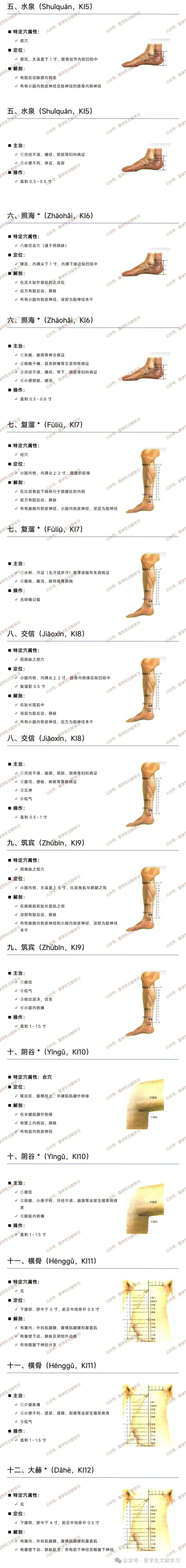 - 水泉(KI5,郄穴):太溪直下 1 寸,主治妇科病、小便不利、淋证。