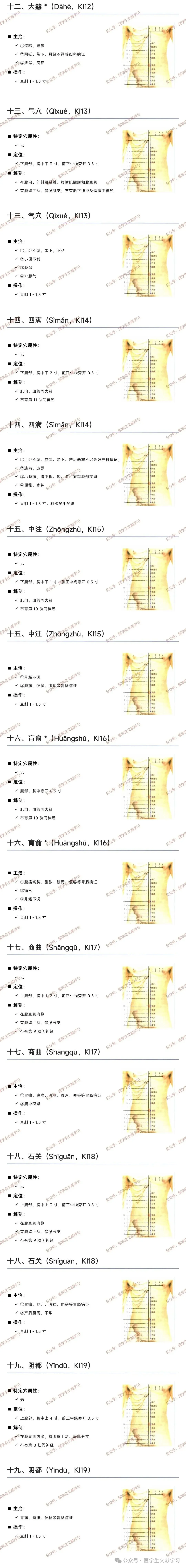 - 大赫(KI12):脐中下 4 寸,前正中线旁开 0.5 寸,主治遗精、阳痿、妇科病。