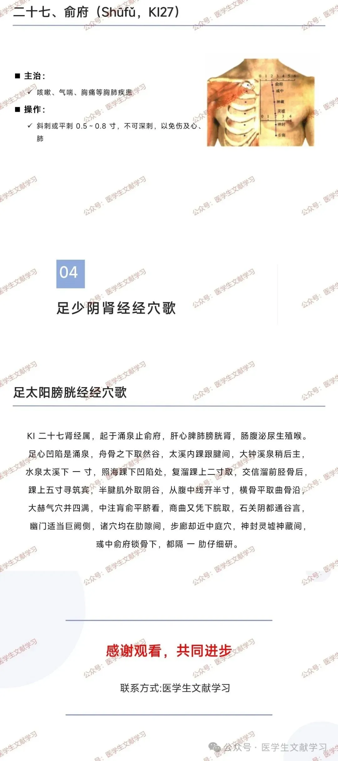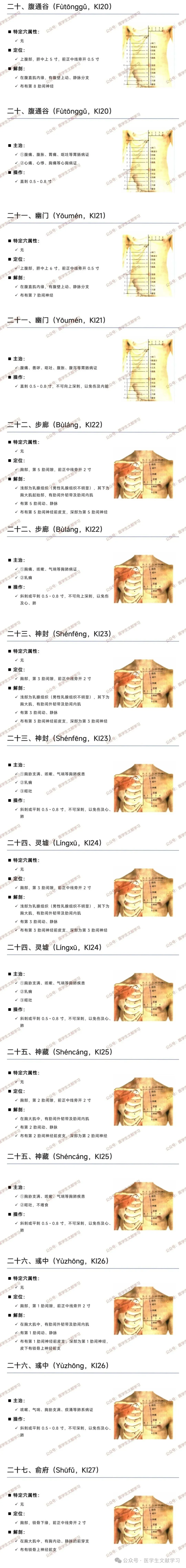 - 胸部穴(步廊、神封等):第 1-5 肋间隙,前正中线旁开 2 寸,主治胸肺疾患、乳痈,操作需斜刺 / 平刺 0.5~0.8 寸,避免伤及心肺。