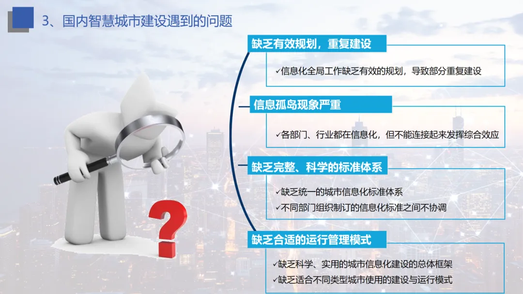 建设现状与问题:随着云计算、大数据技术发展,城市数据成为核心资产,但国内建设存在缺乏有效规划、信息孤岛严重、标准体系不健全、运行管理模式滞后等问题。