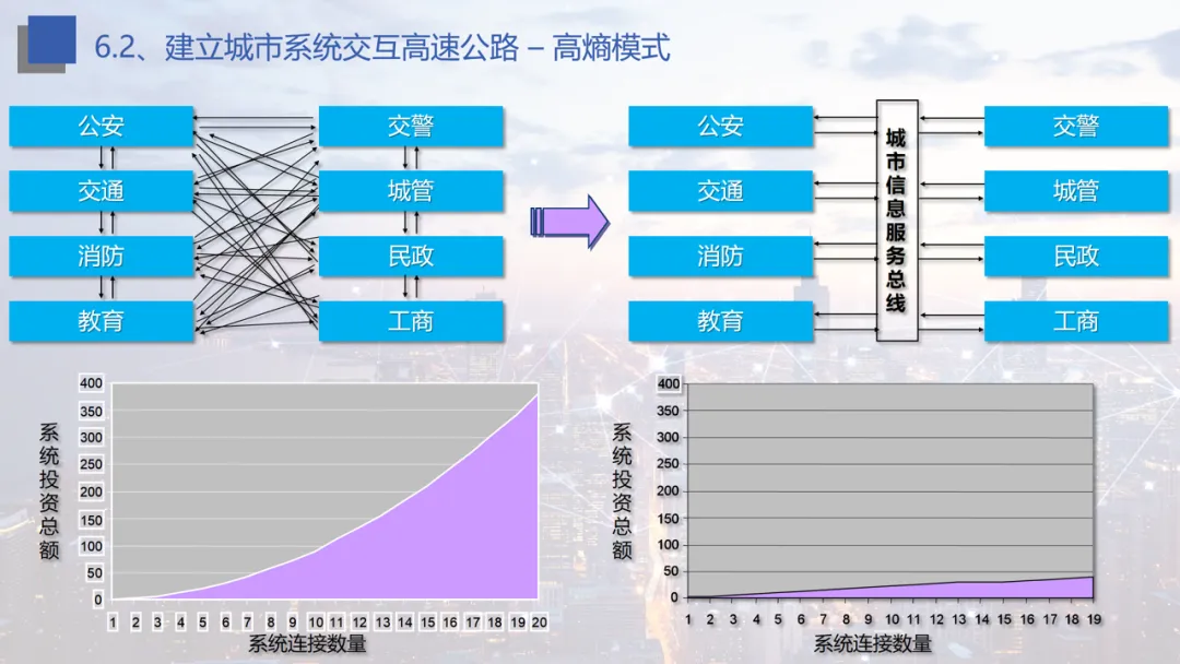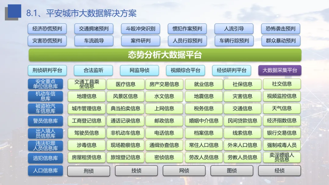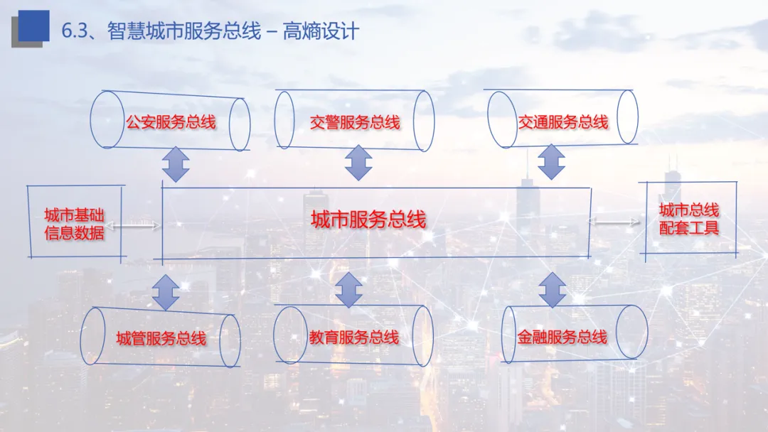 平台架构设计:涵盖基础层、支撑层、应用层的一体化架构,通过城市服务总线技术实现公安、交通、教育等多部门数据互通,解决数据低熵与效率问题。