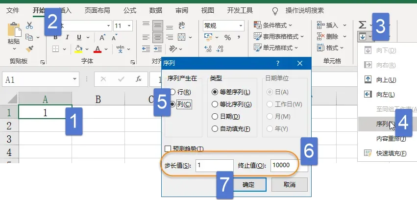 在A1单元格输入数字1,然后依次单击【开始】,【填充】,在下拉列表中选择【系列】,在【序列】对话框中,终止值输入10000,单击【确定】,就可以生成1至10000的连续序号。