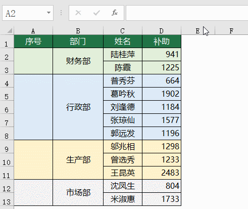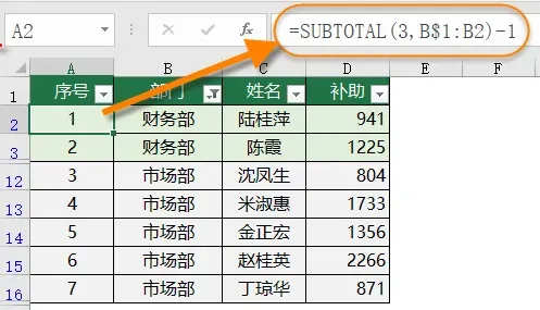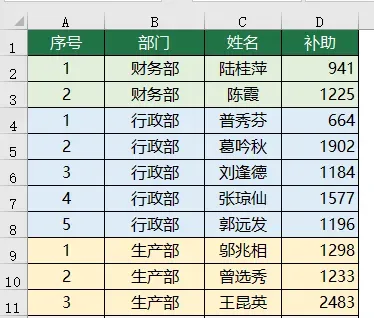 以下图为例,要求按部门单独填写序号,不同部门都要从1开始编号,按顺序递增。