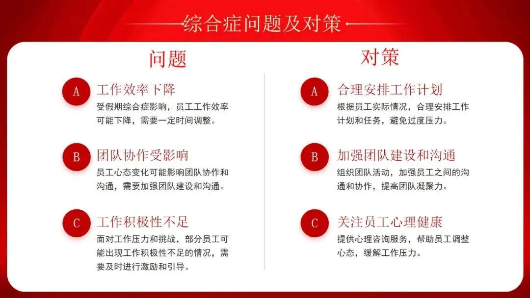 受假期综合症影响,员工工作效率可能下降,需要一定时间调整。