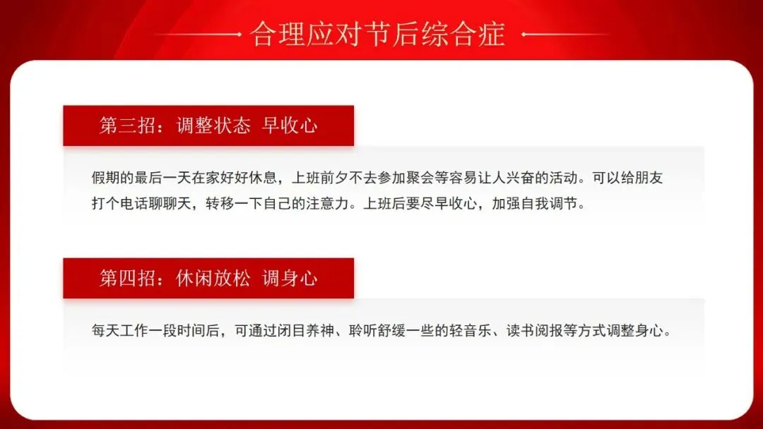 如果发生节后综合征,建议先从工作中的小事做起,进入工作状态后,再去完成难度较大的工作。可在上班的前一天晚上想一下第二天的工作,做些提前准备。