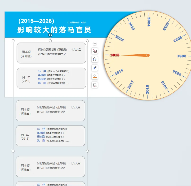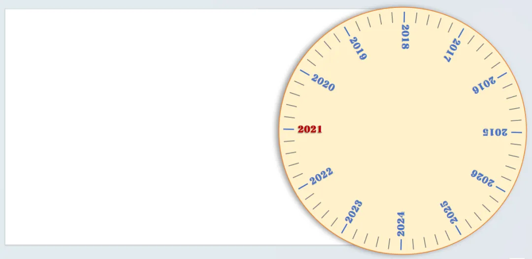 大家好,今天的分享案例是“用时钟圆环做轮转效果”,尤其是“大事记”时间轴专用,比普通时间轴更吸睛、醒目更有仪式感。对于咱们当老师的尤其是历史老师是非常不错的模版选择。1、基础操作方式(利用软件自带的图形纯手工制作);2、进阶插件方式(下载安装iSlide插件,更近准边界);第一步:插入5条竖线(文本框内),默认字体大小,将第一条竖线设置蓝色、加粗,将5条竖线复制12份(总计60条竖线);第二步:选中文本框,打开字符间距,选择加宽,设置25磅;第三步:打开文本工具【效果】—【转换】—【跟随路径】—【圆】;第四步:插入一个圆,填充淡色,设置边框线,置于刻度下方,居中对齐,Ctrl+G进行组合,并置于页面右侧合适位置,如图所示:第五步:添加年份数字手动设置旋转,并摆放在对应位置;到这一步,我们页面的基础就已经完成了,接下来就是我们制作翻转关键步骤了。第九步:复制一页PPT,将文字第二部分向上移动到画面中;将表盘顺时针旋转30度,将对应年份调整到指针位置。我们今天的案例就设计完成了,具体细节上大家根据自己的情况去调整。