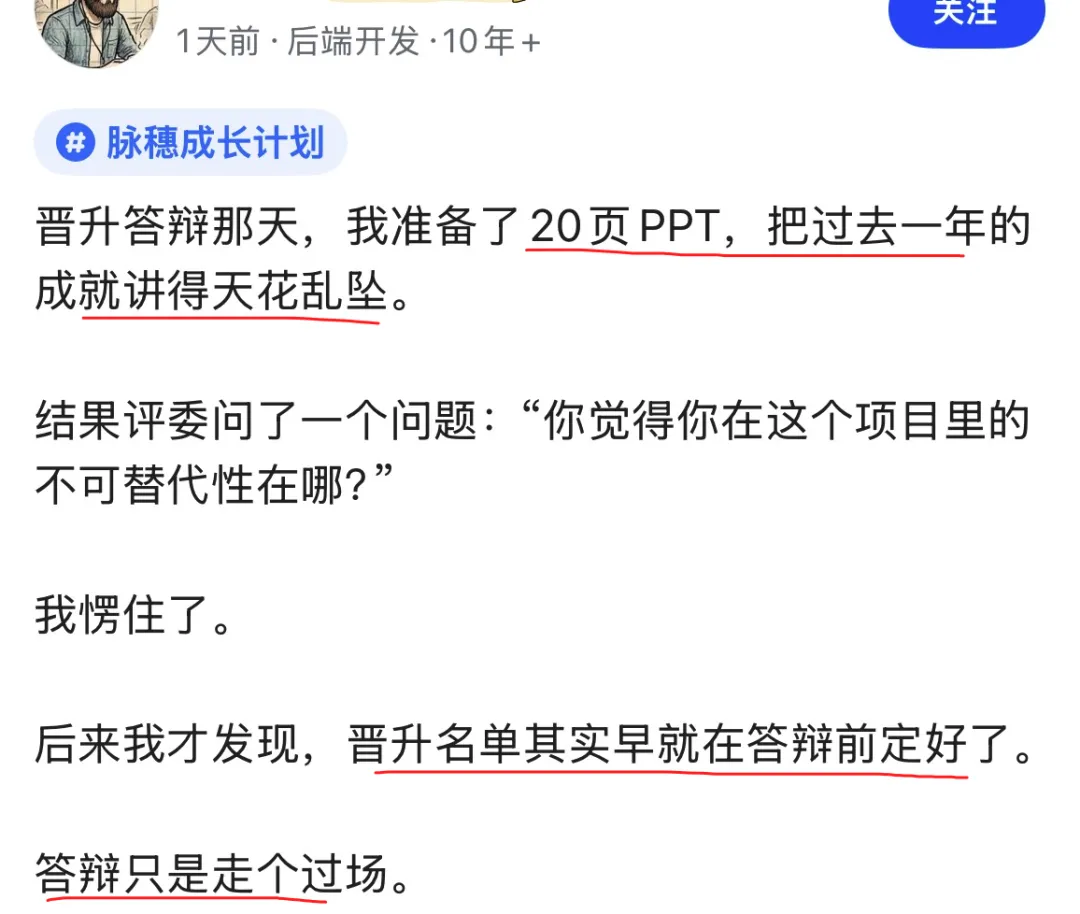 刚看到个贴子,说网友晋升答辩那天准备了20页PPT,把一年成绩吹到天上去,结果评委就问了一句:你在这个项目里的不可替代性是啥?他当场哑火。最后才发现晋升名单早就定好了,答辩只是走流程。