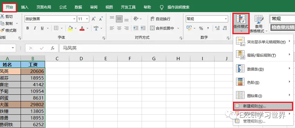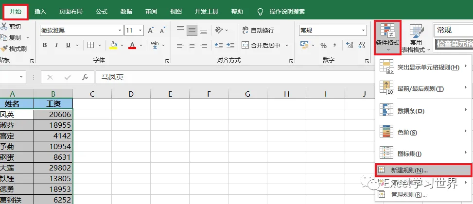 5. 保持选中数据表区域 --> 再次选择菜单栏的“开始”-->“条件格式”-->“新建规则”