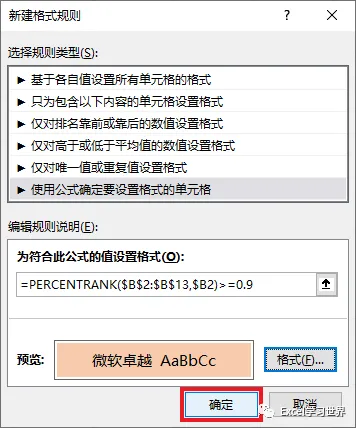 =PERCENTRANK($B$2:$B$13,$B2)>=0.9