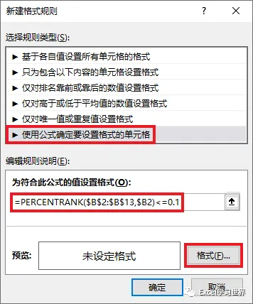6. 选择“使用公式确定要设置格式的单元格”--> 输入以下公式 --> 点击“格式”