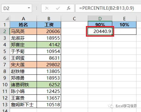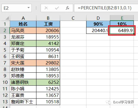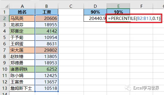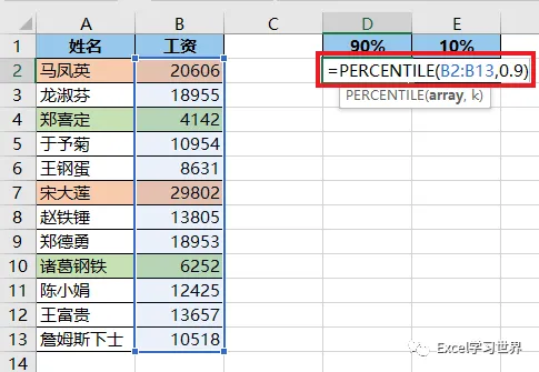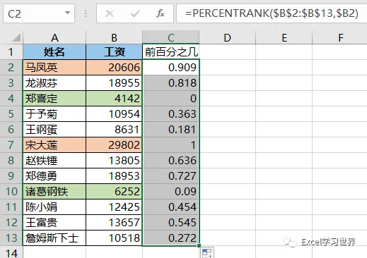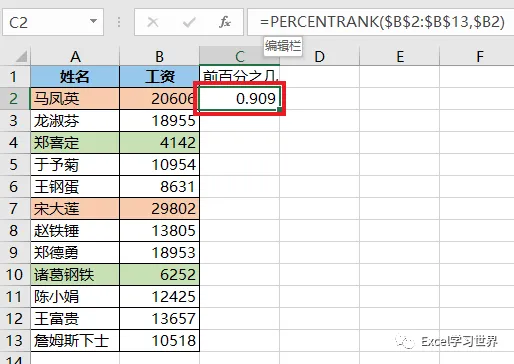 如果用大家听得懂的话来解释,区域 $B$2:$B$13 中小于 $B2 的值有 10 个,而大于它的值只有 1 个,因此结果为 10/(10+1)=0.909