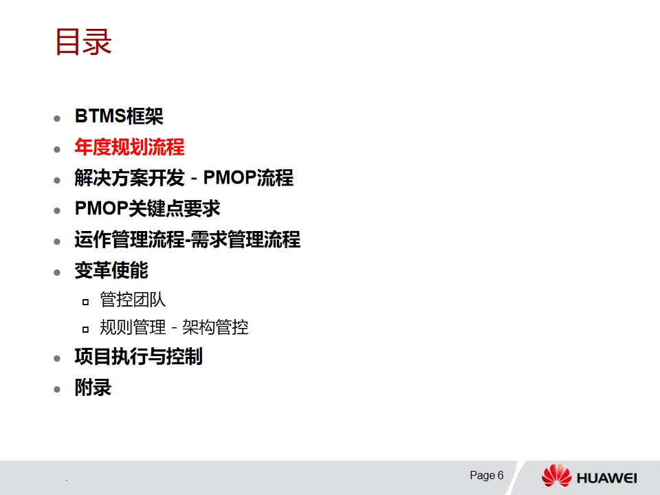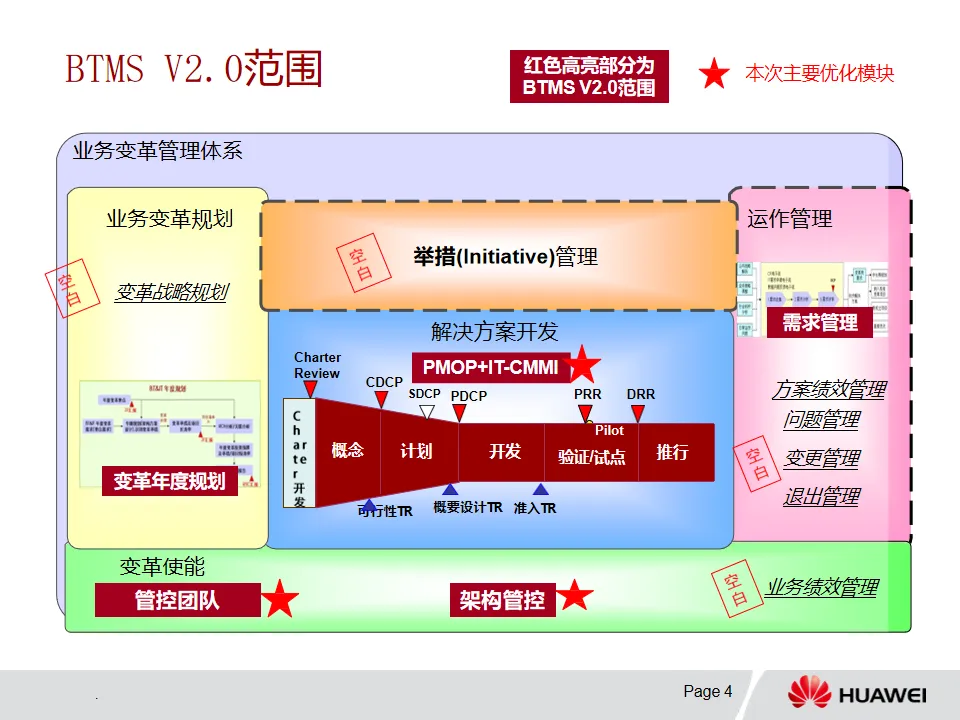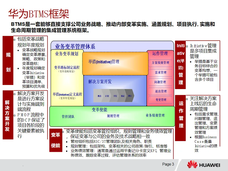 1. BTMS框架概述:BTMS是集成管理系统框架,涵盖变革战略规划、年度规划、解决方案开发、Initiative管理和运作管理等。变革使能包含管控组织、规则管理和业务绩效管理,确保变革与公司战略一致。V2.0版本重点优化项目评审、PMOP流程裁剪并增加架构管控及其支撑团队。