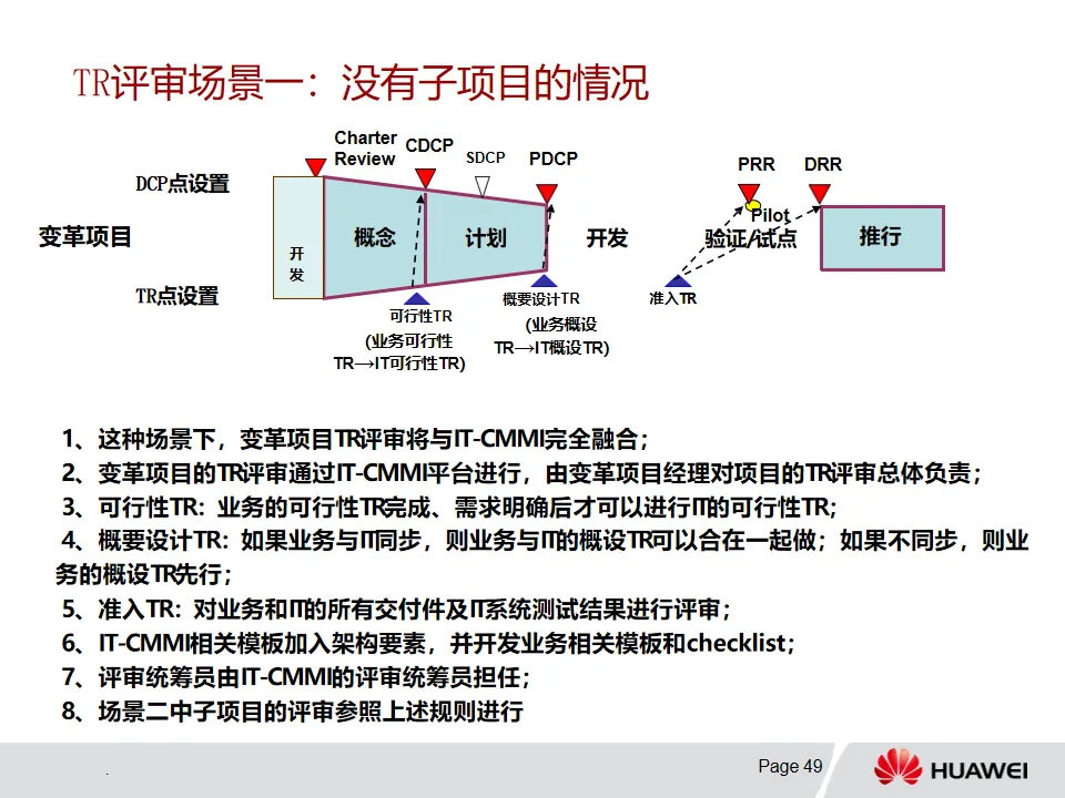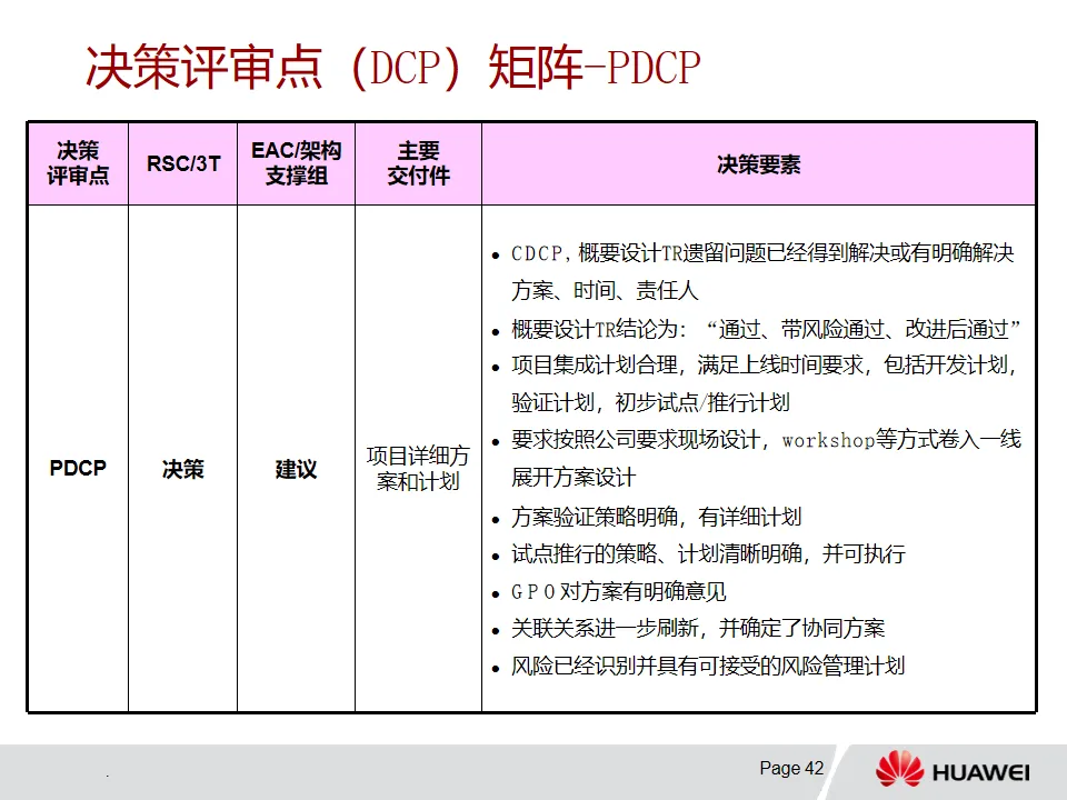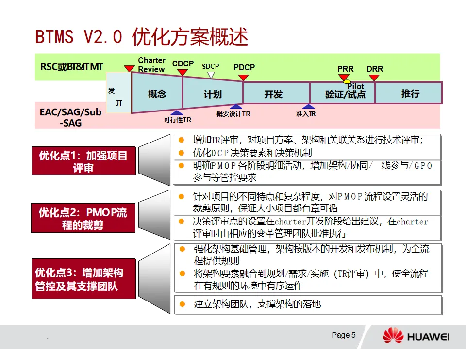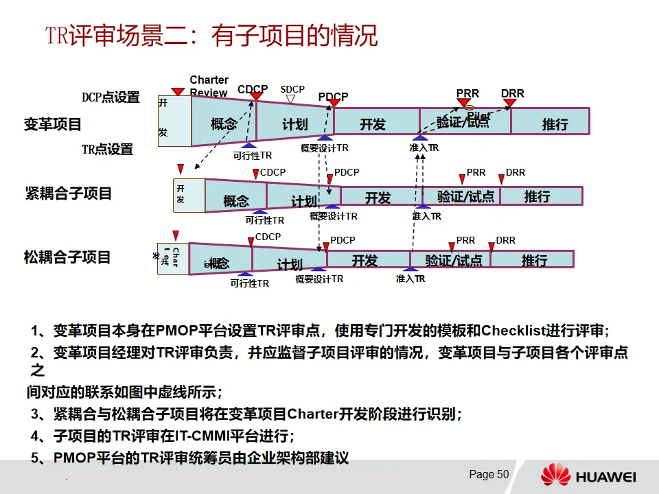 3. 解决方案开发-PMOP流程:该流程从Charter开发阶段依据业务痛点明确项目范围等信息,经概念、计划、开发、验证/试点和推行等阶段推进项目。各阶段有特定目标、输入输出和评审要求,例如概念阶段确定业务需求与初始解决方案,计划阶段基线化项目目标和集成计划。DCP和TR评审在不同阶段发挥关键决策和技术把关作用,且流程可根据项目特点裁剪。