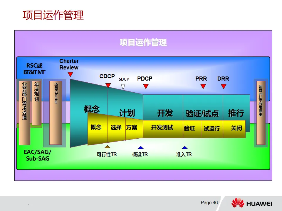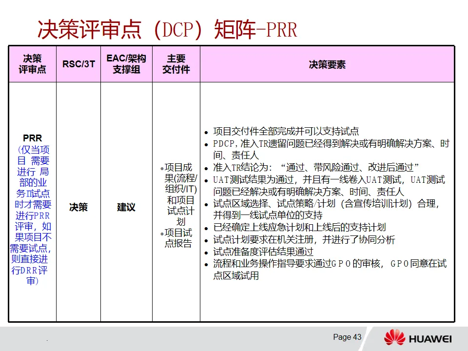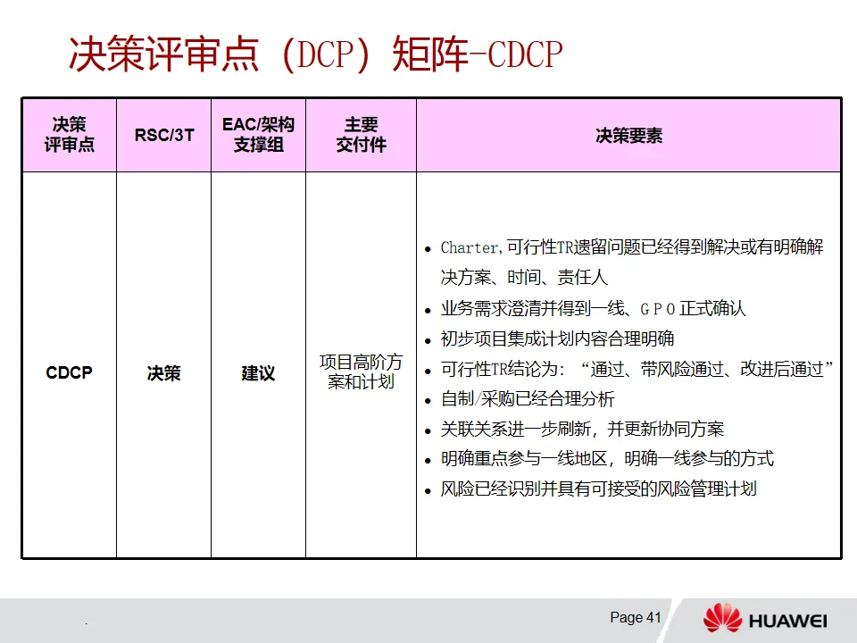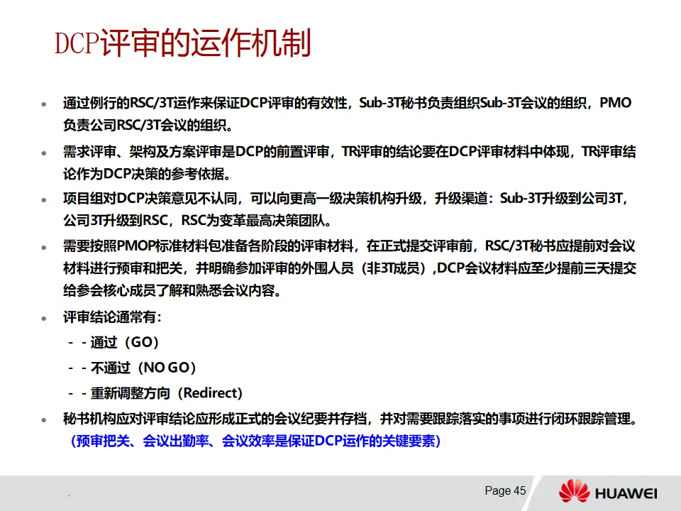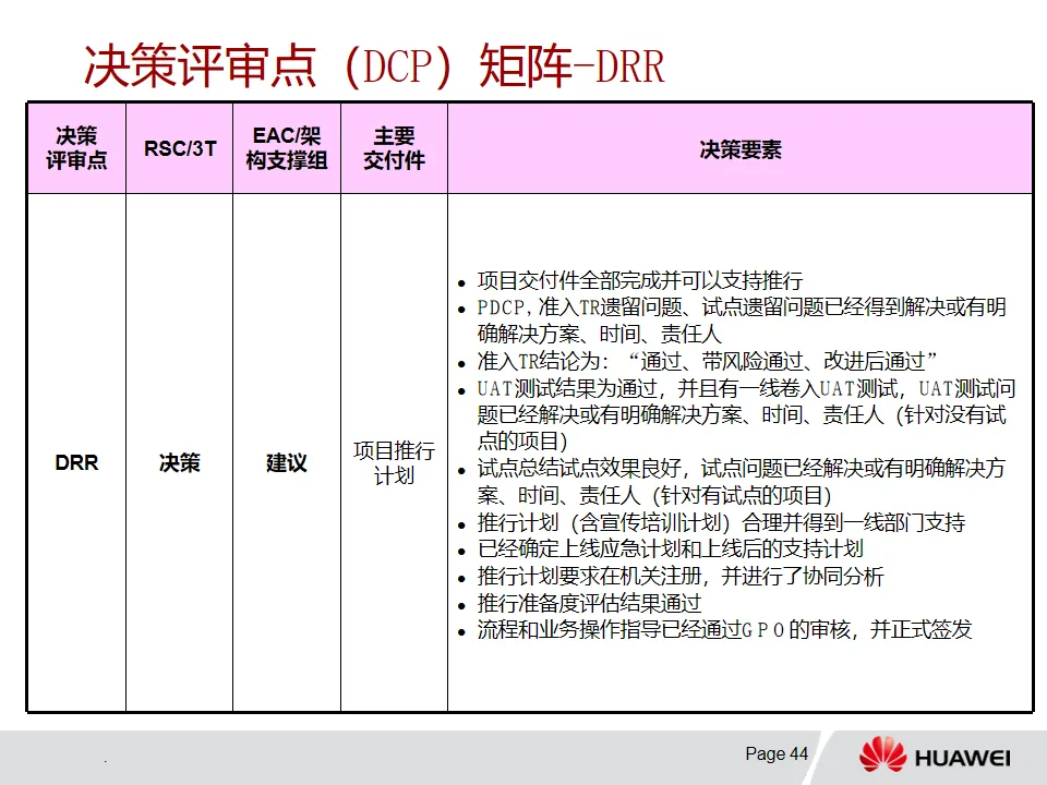 3. 解决方案开发-PMOP流程:该流程从Charter开发阶段依据业务痛点明确项目范围等信息,经概念、计划、开发、验证/试点和推行等阶段推进项目。各阶段有特定目标、输入输出和评审要求,例如概念阶段确定业务需求与初始解决方案,计划阶段基线化项目目标和集成计划。DCP和TR评审在不同阶段发挥关键决策和技术把关作用,且流程可根据项目特点裁剪。