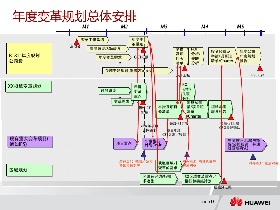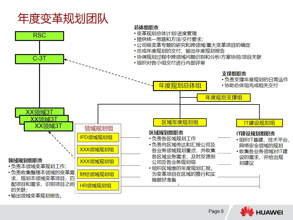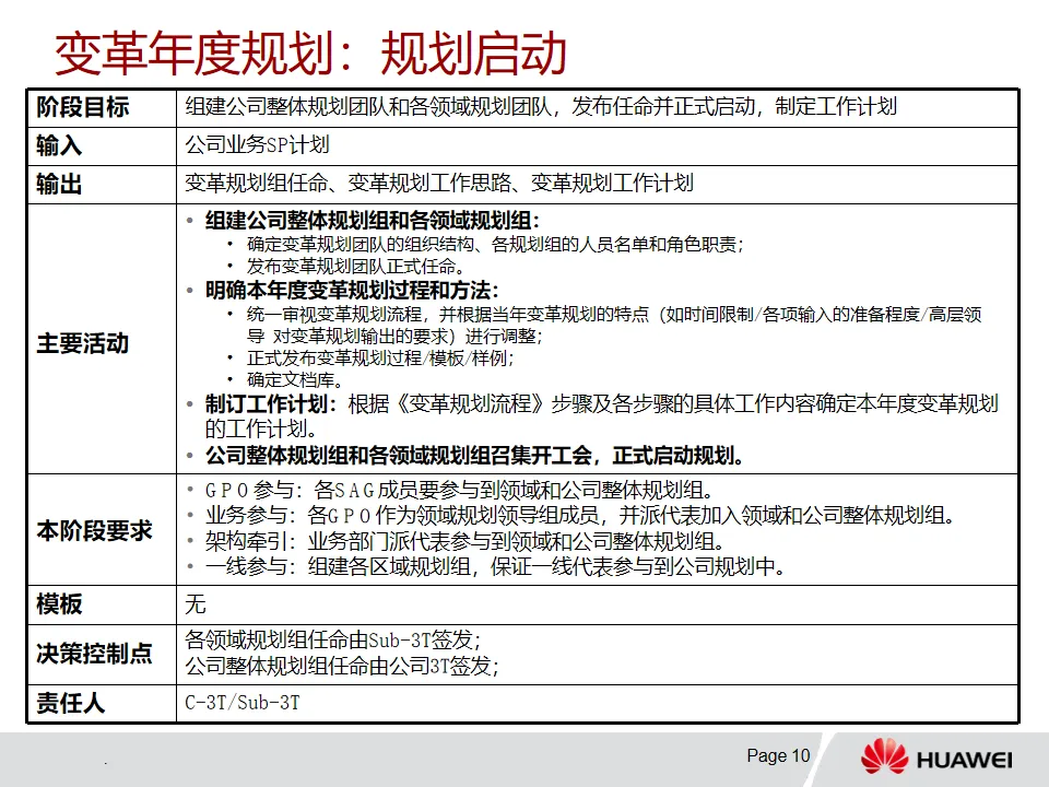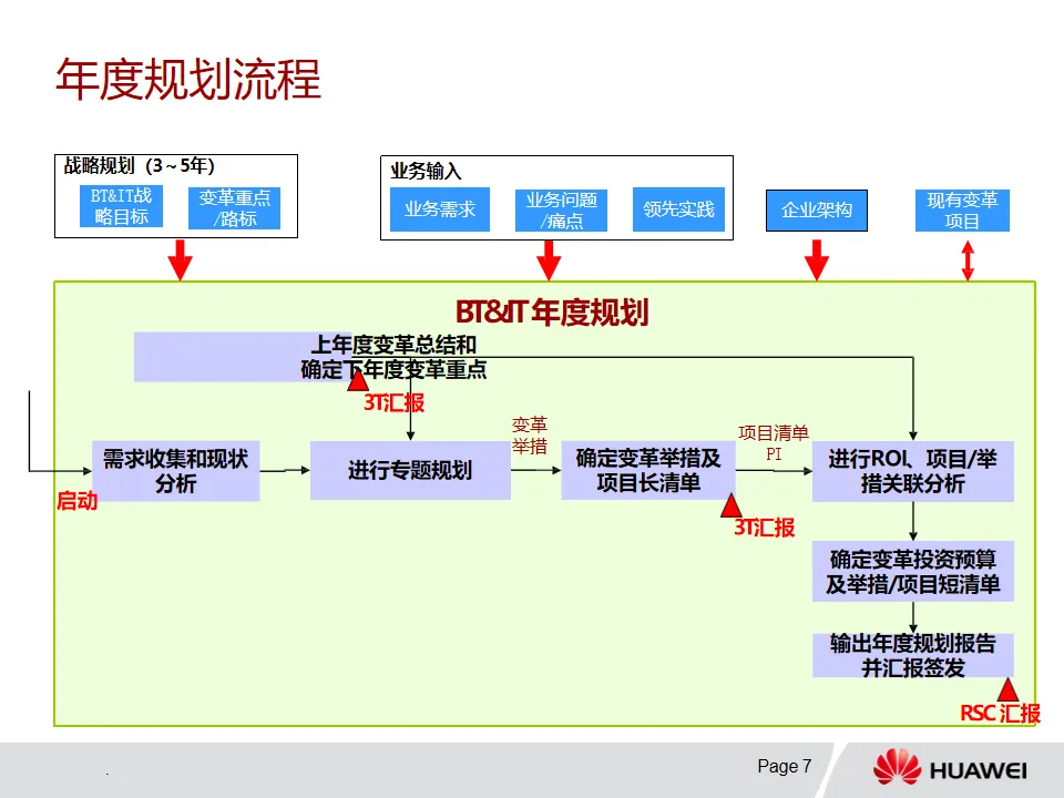 2. 年度规划流程:从规划启动开始,组建规划团队,收集需求并分析现状。对上年度变革总结,确定下年度变革重点,针对重点进行专题规划,进而确定变革举措及项目长清单。随后进行ROI和关联分析,确定投资预算与短清单,最终输出年度规划报告。该流程涉及总体组、支撑组、领域规划组和区域规划组等,各有明确职责,且强调GPO、业务部门、一线和架构团队的多方参与。
