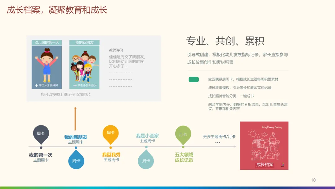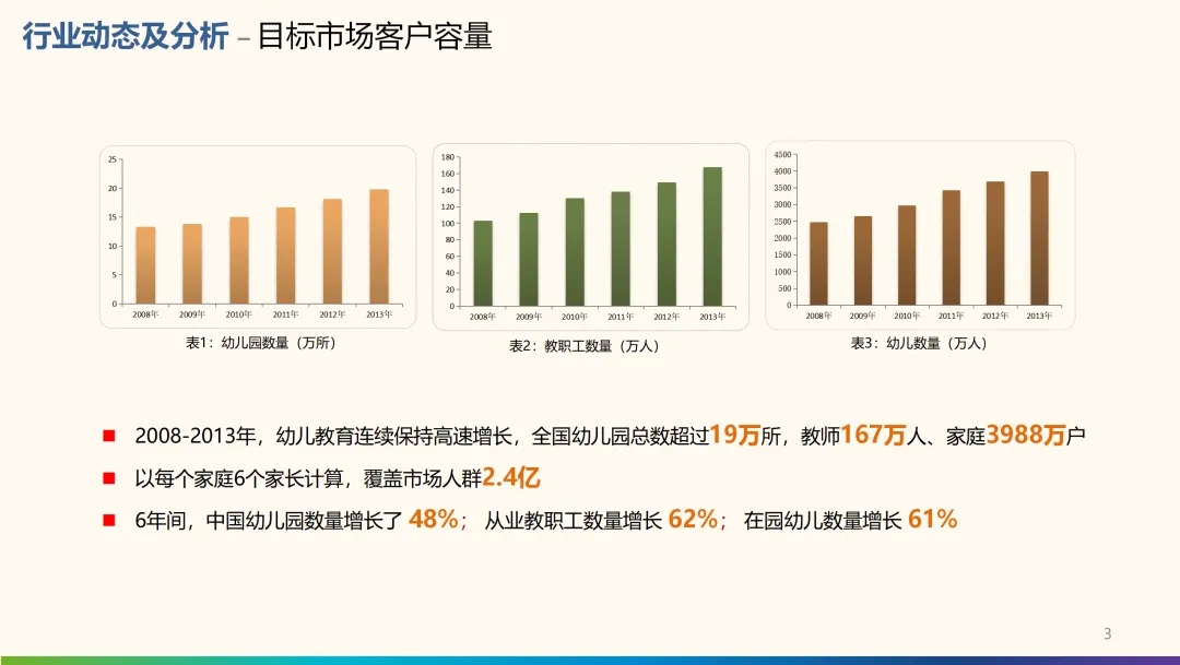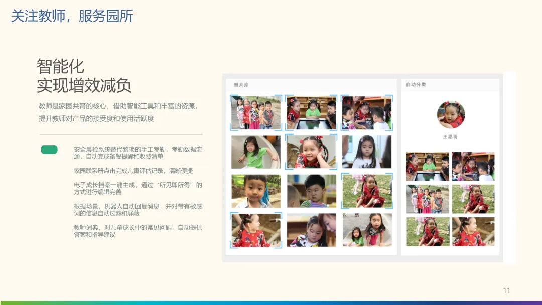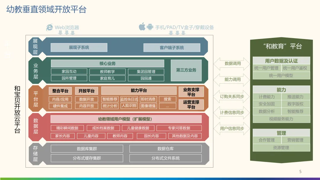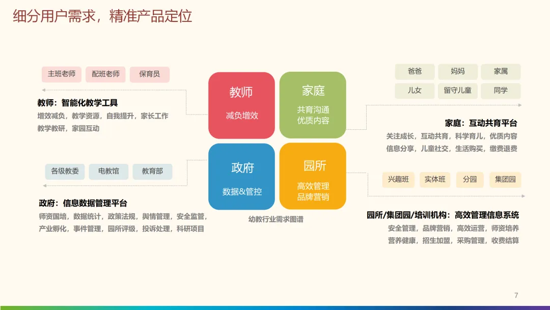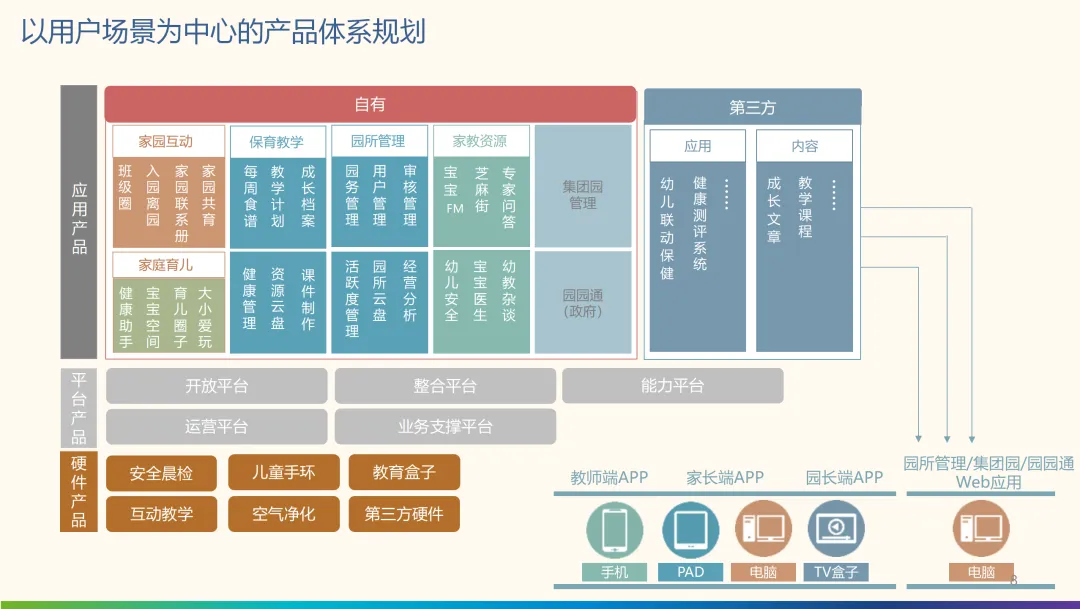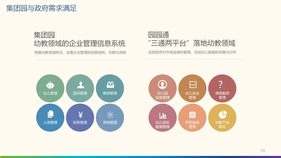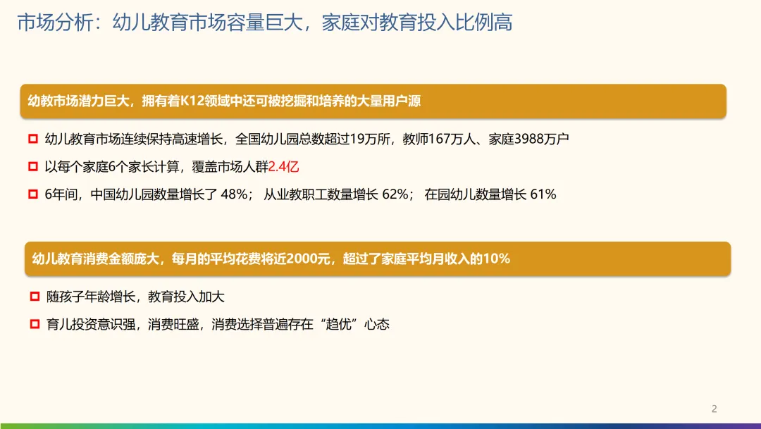 方案首先分析了幼儿教育市场的现状,指出市场容量巨大,家庭对教育投入比例高,且消费旺盛。基于此背景,方案提出了以教育属性为核心,结合智能化、定制化、多层级用户产品的设计理念,通过展现层、业务层、平台层、数据层的架构设计,实现家园互动、教师教学、园所管理、集团园管理以及第三方业务的全面数字化。