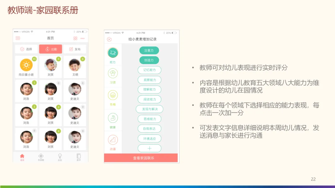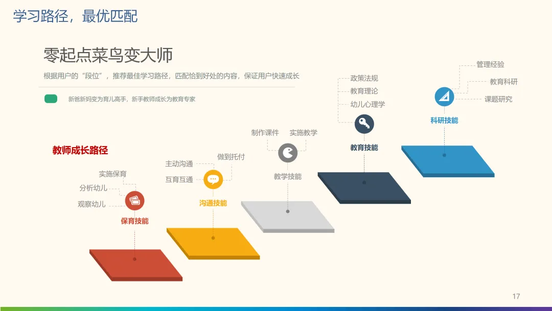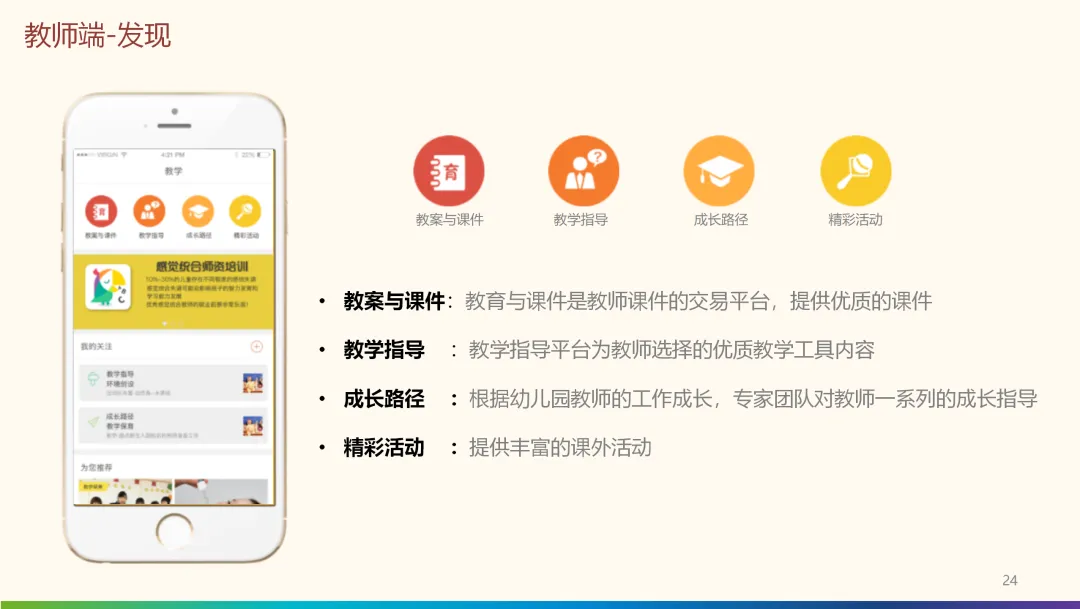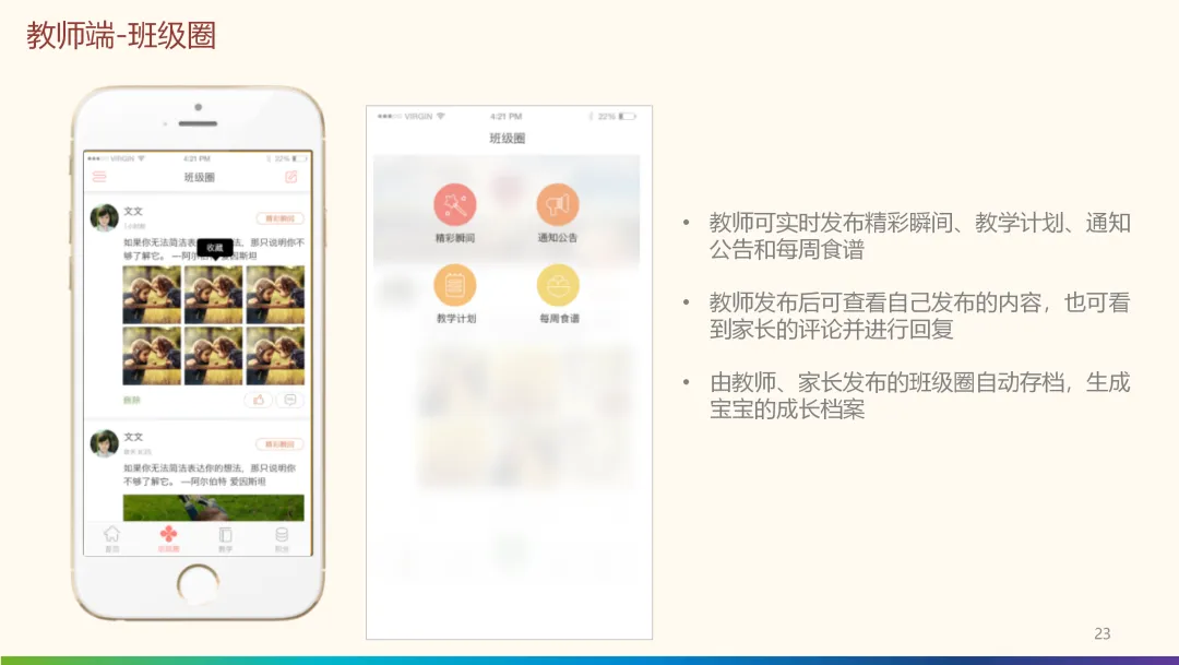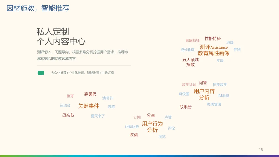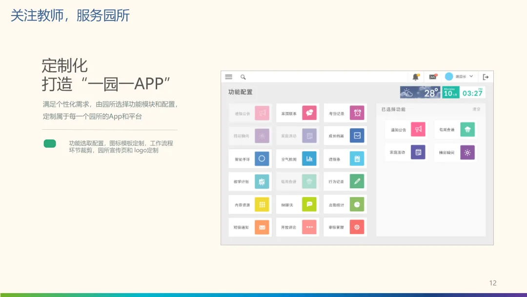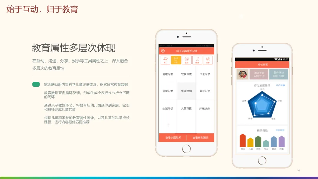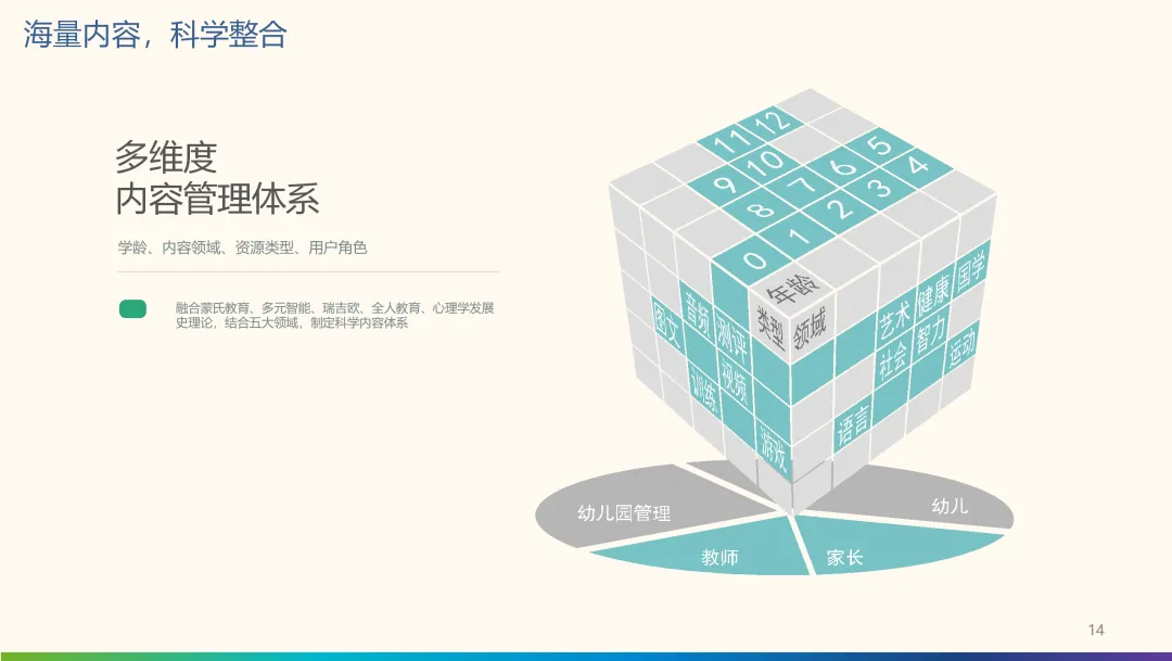 方案首先分析了幼儿教育市场的现状,指出市场容量巨大,家庭对教育投入比例高,且消费旺盛。基于此背景,方案提出了以教育属性为核心,结合智能化、定制化、多层级用户产品的设计理念,通过展现层、业务层、平台层、数据层的架构设计,实现家园互动、教师教学、园所管理、集团园管理以及第三方业务的全面数字化。