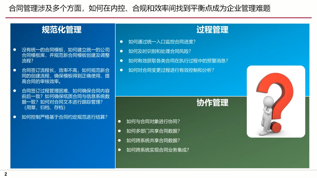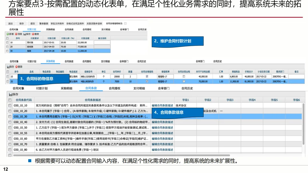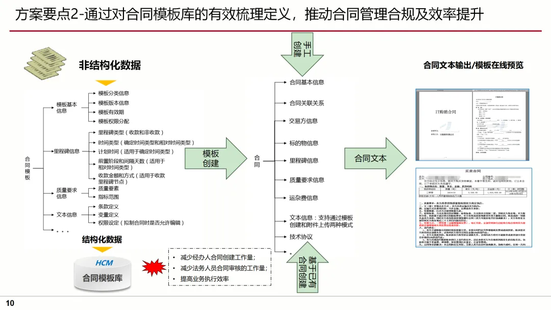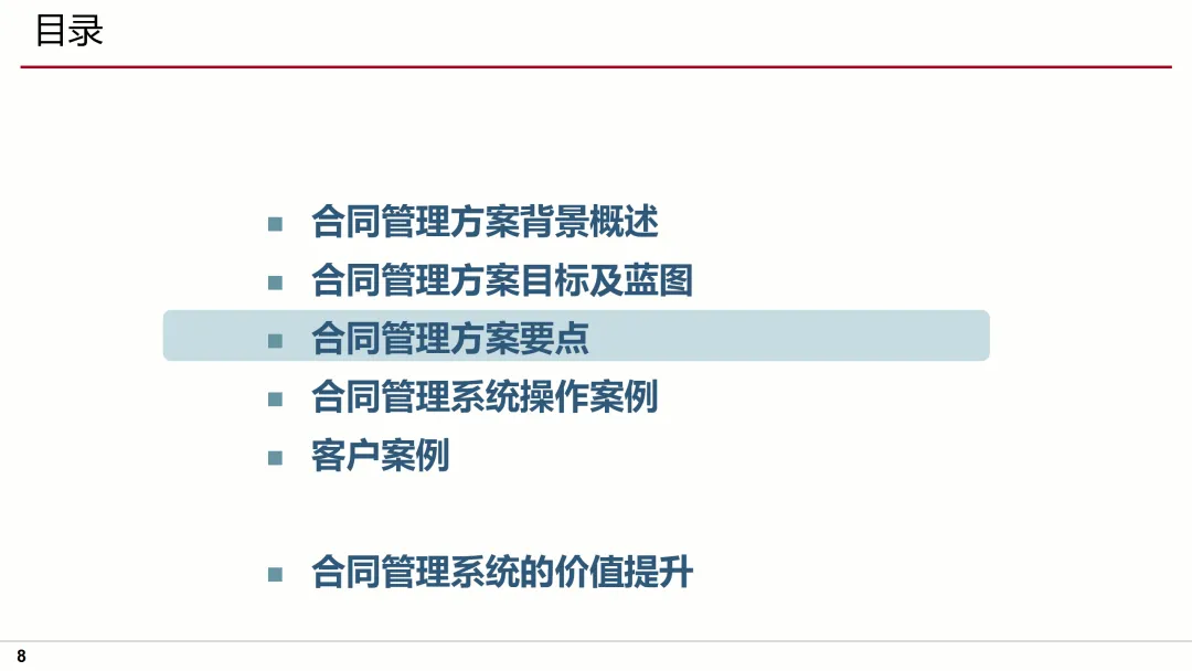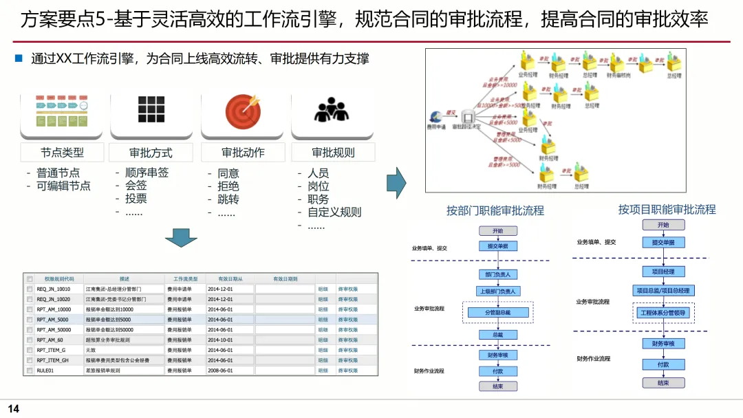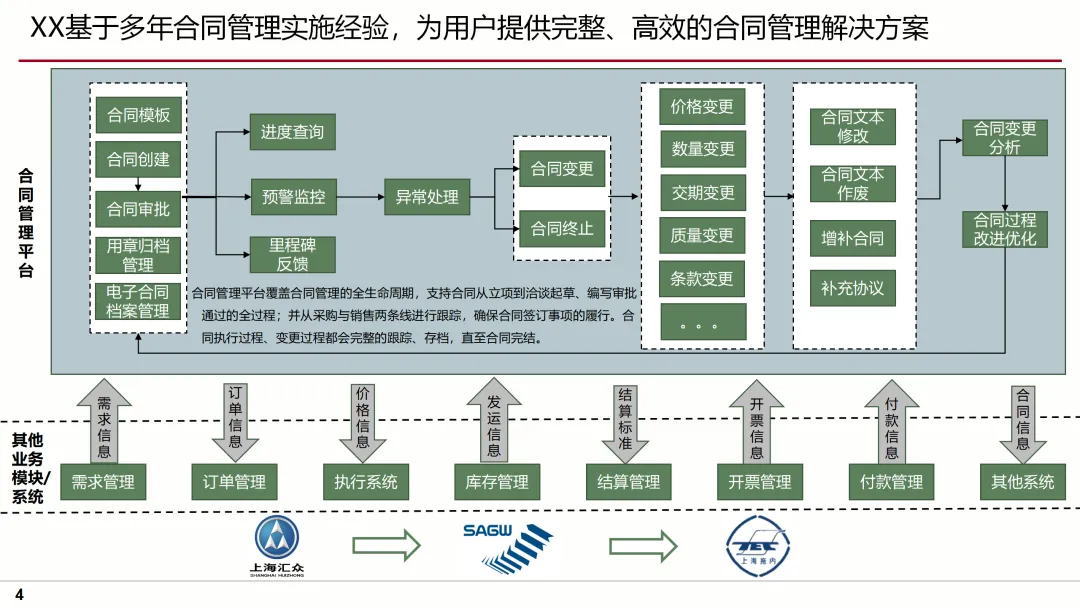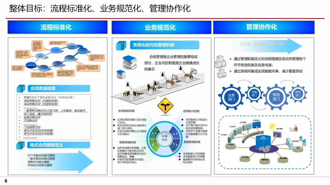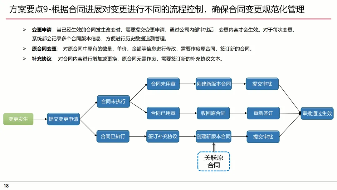 针对这些问题,方案提出了明确的目标及蓝图,即通过流程标准化、业务规范化、管理协作化,实现合同管理的全面升级。方案要点涵盖了合同模板库的建立、合同审批流程的优化、合同执行过程的跟踪、合同变更的规范化管理等多个方面,确保合同管理的每一个环节都得到有效控制。