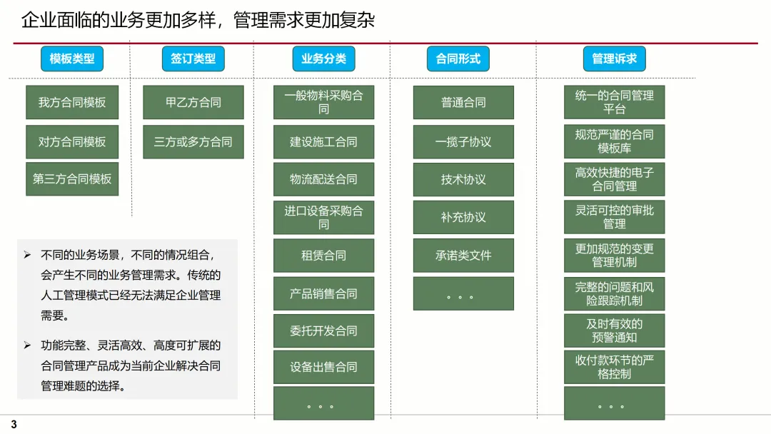 本方案旨在为企业提供一套全面、高效、合规的合同管理解决方案,以应对传统人工管理模式下存在的效率低、管理难、风险高等问题。方案从合同管理背景概述出发,深入分析了企业在合同管理中面临的挑战,如合同模板不统一、签订流程长、过程管理困难等。