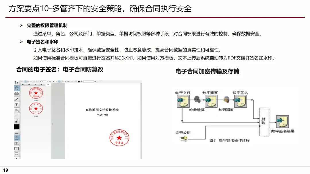 在具体实施上,方案提供了合同管理系统操作案例,详细展示了合同创建、审批、执行、变更、结算等全生命周期的管理流程。同时,通过引入电子签名、水印技术、多维度查询分析报表等功能,进一步提升了合同管理的效率和安全性。