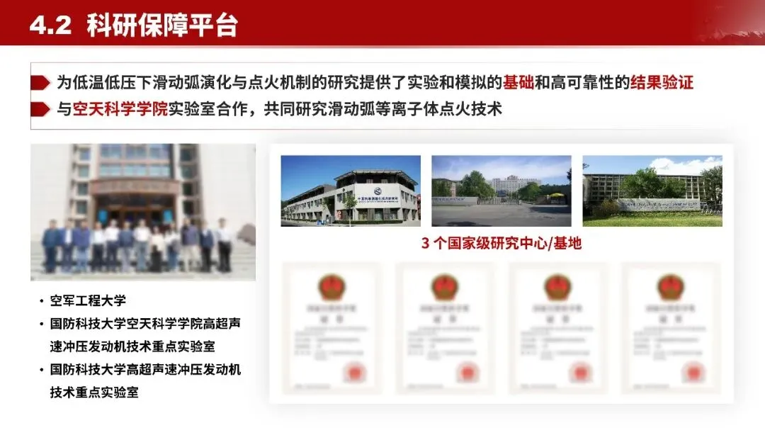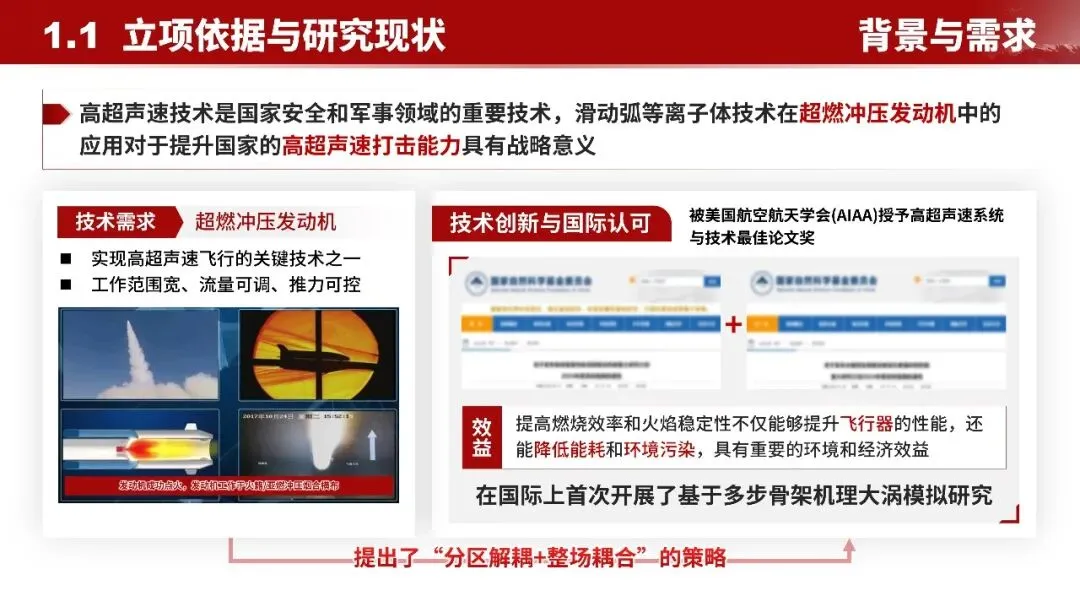 - 战略意义重大研究的滑动弧等离子体技术是超燃冲压发动机的关键点火手段,直接服务于高超声速飞行器技术,对提升国家安全和军事打击能力有重要作用。