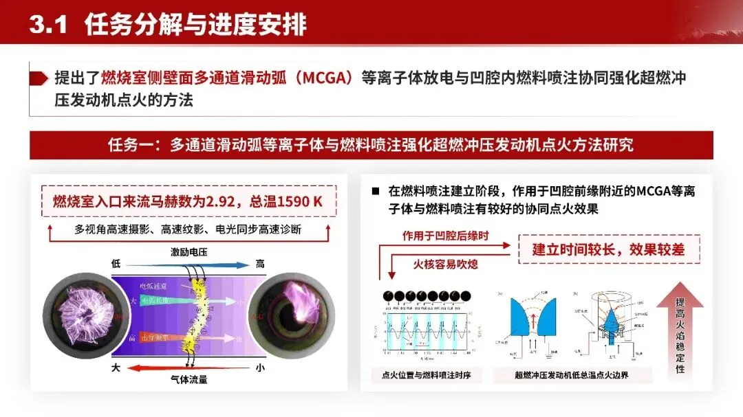 - 多通道滑动弧点火技术在超燃冲压发动机燃烧室侧壁面,通过多通道滑动弧(MCGA)等离子体放电与凹腔内燃料喷注协同,实现强化点火。