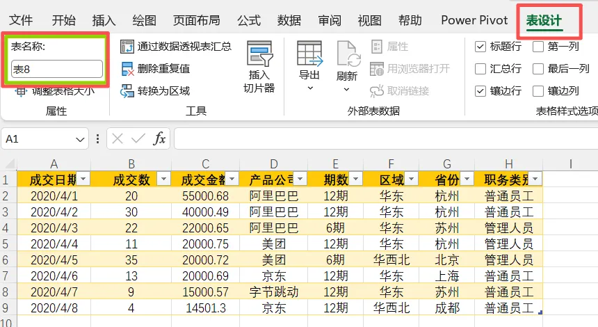 创建表后在选项卡中,会增加一个表设计的选项,可以对表进行命名。