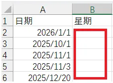 如下图所示,A列中存放的是日期类型的数据,现要求将它们转换成星期,并输出到B列