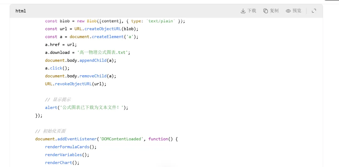这一个提示词,它不是让 AI 直接生成一个可以直接下载文件(这个对于目前的AI来说还是比较困难的),而是让 AI 生成一个包含下载功能的网页就简单很多了,