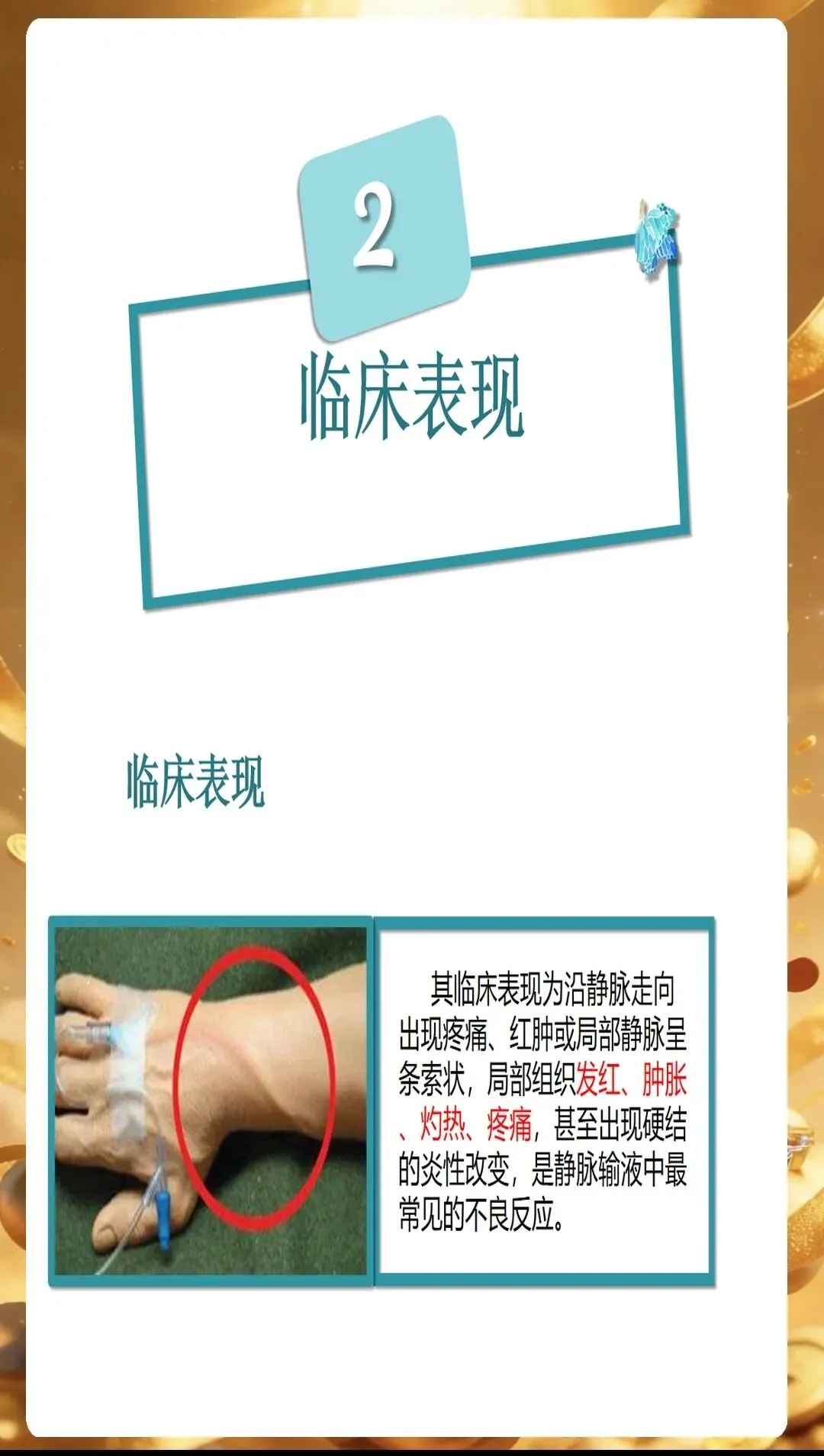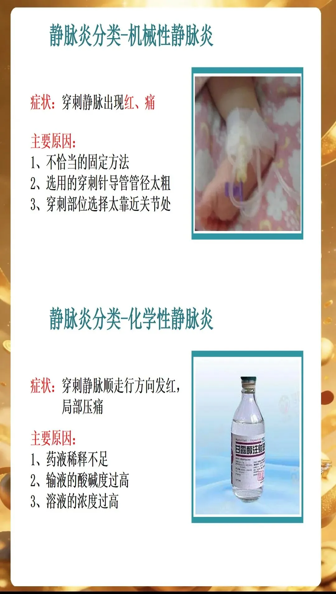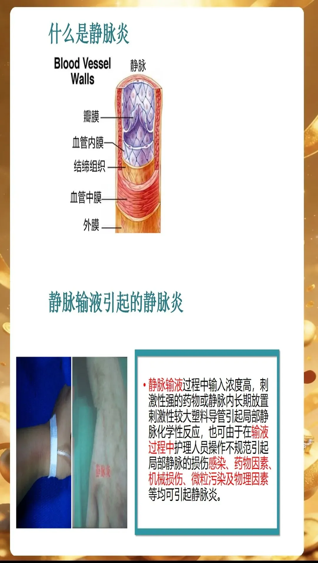 PPT开篇就点明,静脉炎的发生往往与多种因素相关,只有精准识别诱因,才能从源头做好预防。首先是药物因素,高渗性药物、化疗药物、抗生素等刺激性较强的药物,容易损伤血管内皮细胞,引发炎症反应。比如输注甘露醇时,如果速度过快,药物在局部血管内浓度过高,就会刺激血管壁,增加静脉炎风险。