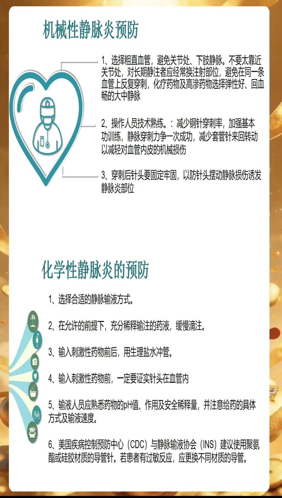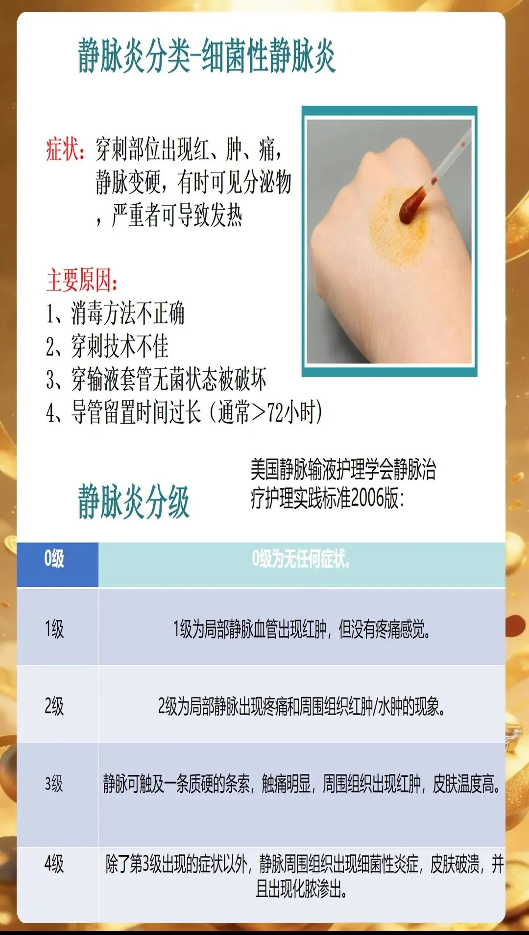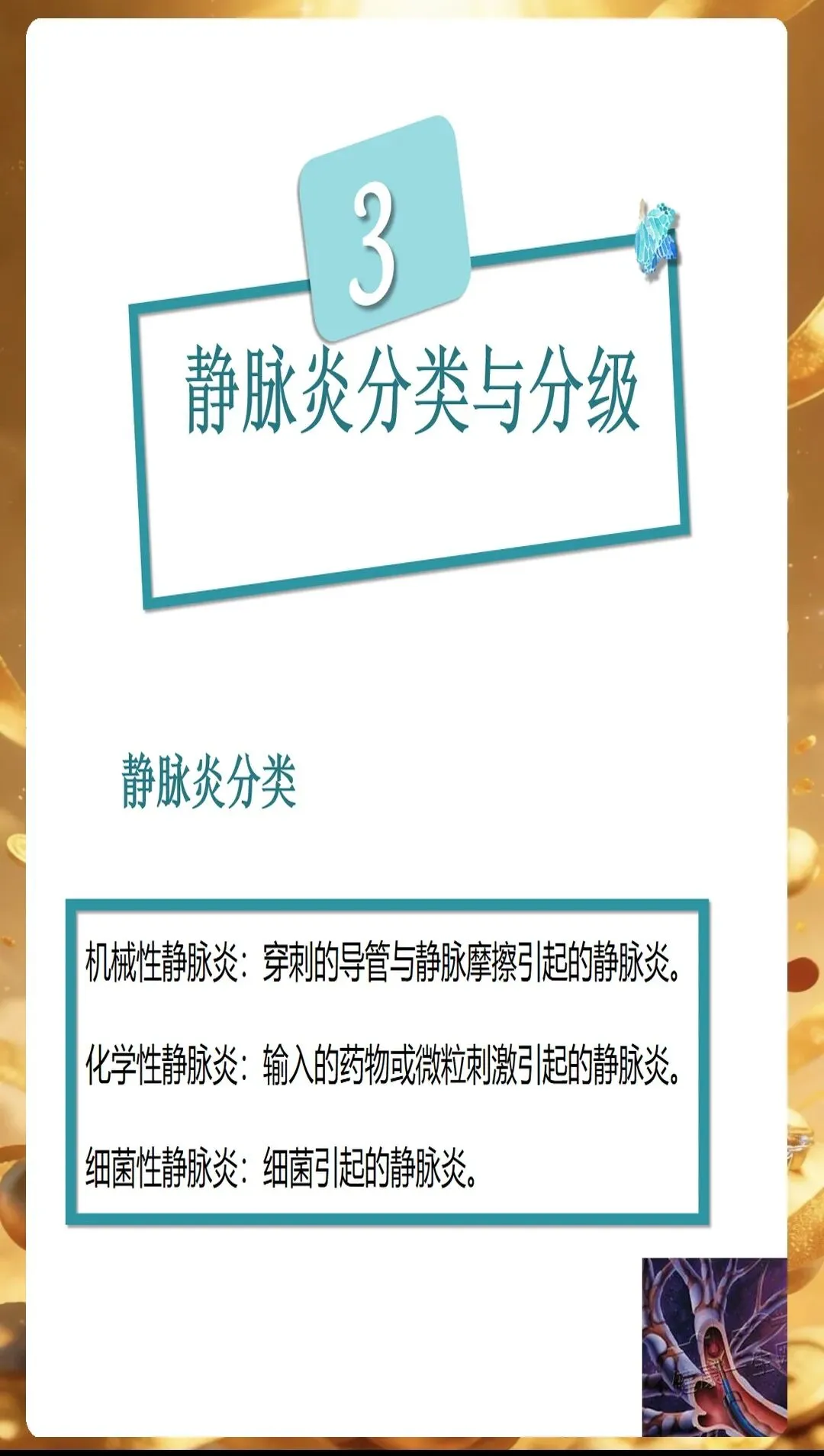 PPT开篇就点明,静脉炎的发生往往与多种因素相关,只有精准识别诱因,才能从源头做好预防。首先是药物因素,高渗性药物、化疗药物、抗生素等刺激性较强的药物,容易损伤血管内皮细胞,引发炎症反应。比如输注甘露醇时,如果速度过快,药物在局部血管内浓度过高,就会刺激血管壁,增加静脉炎风险。