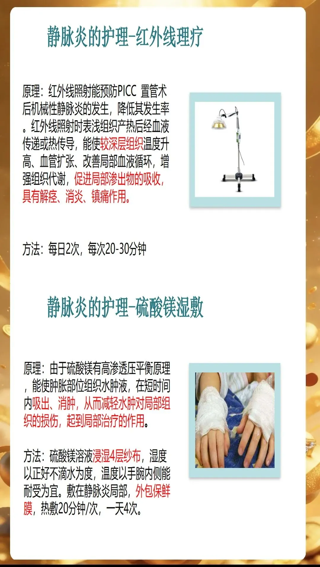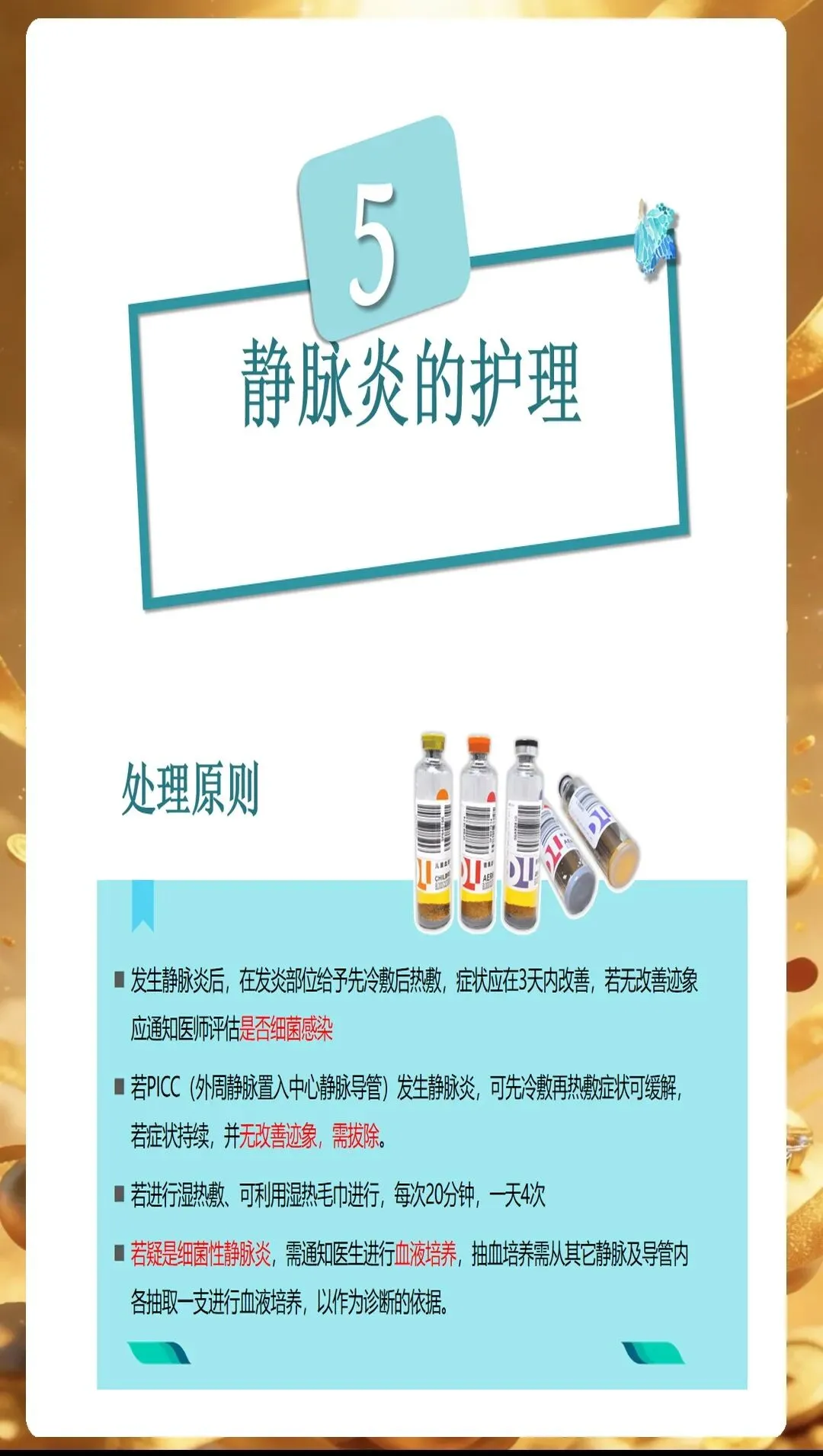 对于Ⅱ级及以上静脉炎,局部出现水疱、条索状硬结时,要加强局部护理,避免水疱破溃引发感染。可在湿敷的基础上,配合红外线照射,促进局部血液循环,加速炎症消退。如果出现脓性分泌物,要及时进行分泌物培养,根据培养结果选择敏感抗生素进行治疗。