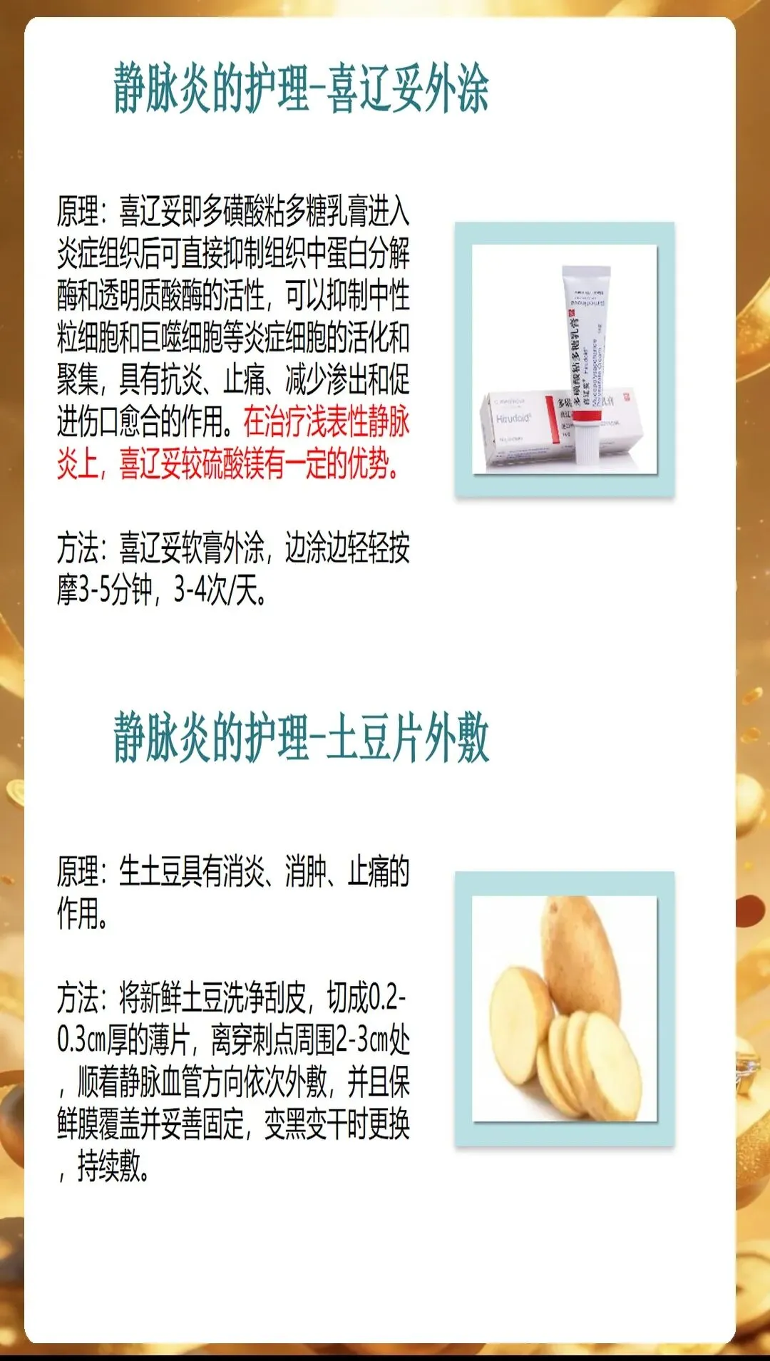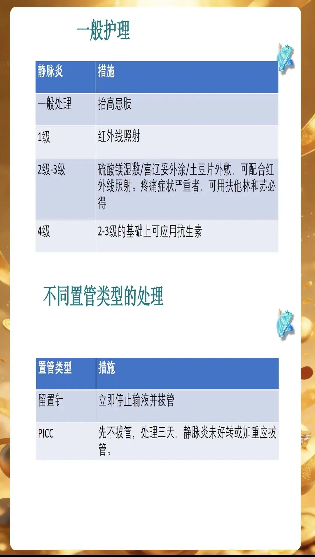 一旦发生静脉炎,及时有效的护理干预能够缓解患者症状,促进炎症消退。PPT中详细讲解了不同程度静脉炎的护理方法。对于Ⅰ级静脉炎,局部仅有红肿疼痛,可采用50%硫酸镁湿敷或土豆片外敷,每天2-3次,每次20-30分钟,促进局部炎症吸收。同时指导患者抬高患肢,促进血液回流,缓解肿胀疼痛。