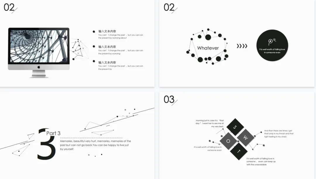 1. 商务类:保持线条简洁流畅,不添加多余装饰,一页只讲一个重点,多放数据少堆文字,配色不超过3种,突出工作成果和高级感