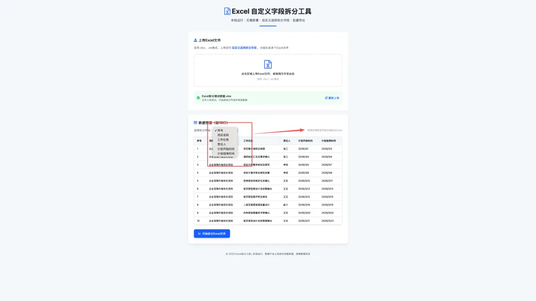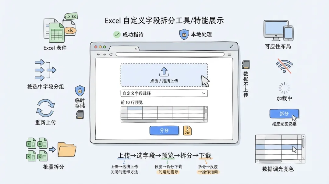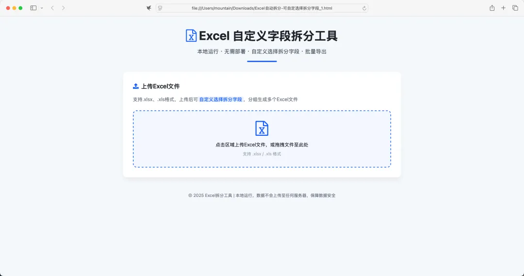 划重点!这款工具全程在浏览器里操作,无需联网,数据不上传任何服务器。所有解析、拆分、打包步骤都在本地完成,再也不用担心客户信息、薪酬、财务数据等敏感内容外泄,安全感拉满!